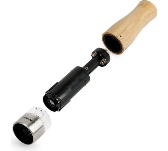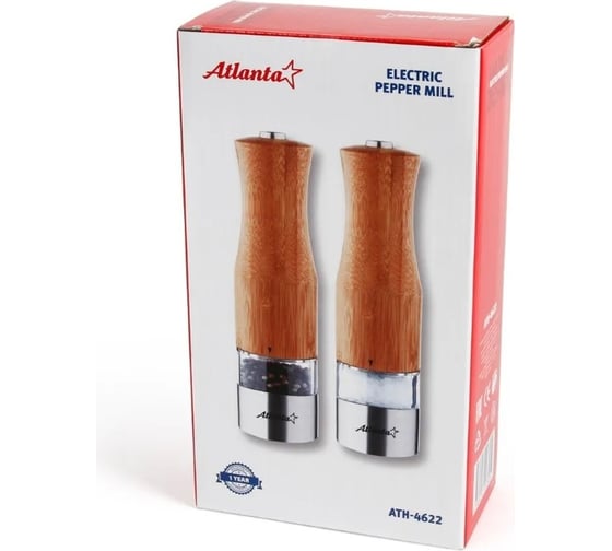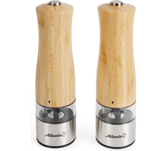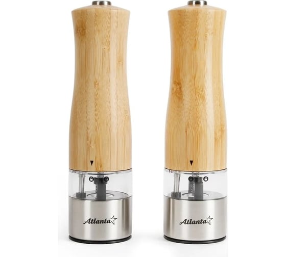 ATH-4622 (brown) Набор из двух электрических мельниц для специй Atlanta, работа от 6хААА батареек. Долговечный керамический механизм, корпус из экологичного материала - бамбука, нижняя часть выполнена из нержавеющей стали. Регулировка степени помола.
