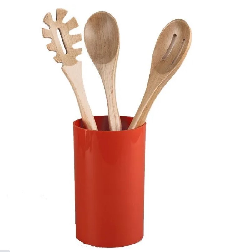 В набор кухонных приборов входят: поварская ложка, ложка для спагетти, шумовка, стакан-подставка