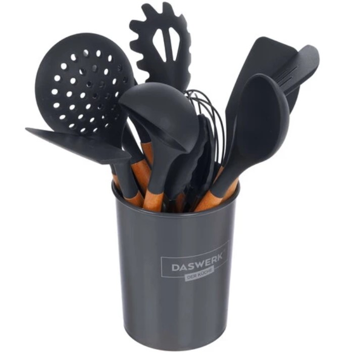 Стильный и функциональный набор силиконовых кухонных принадлежностей DASWERK с подставкой. Станет незаменимым помощником для всех, кто умеет и любит готовить.