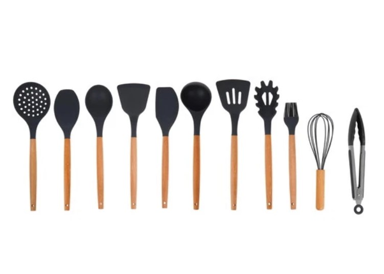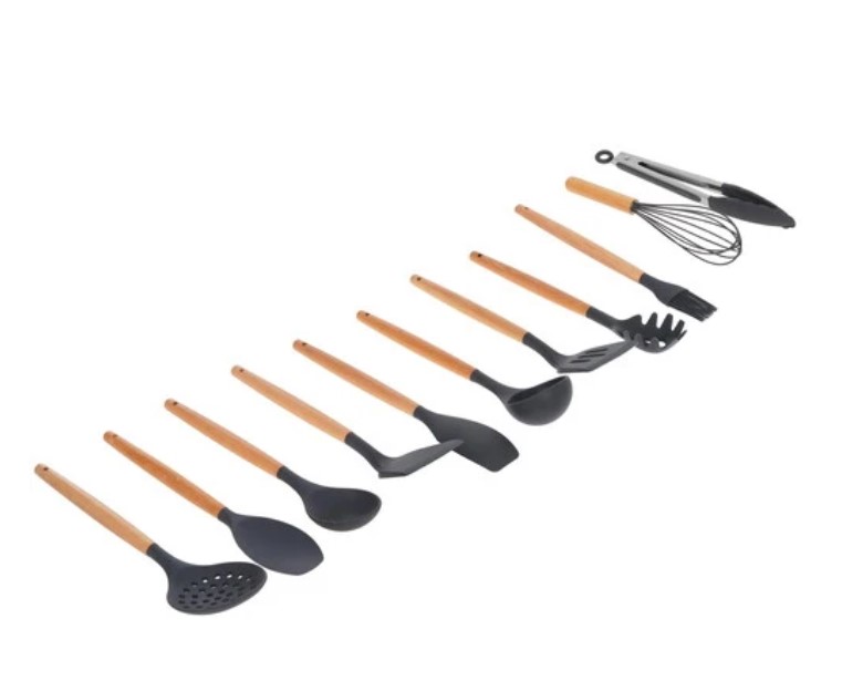 Рабочая часть кухонных принадлежностей изготовлена из пищевого силикона, а ручки – из дерева (бук).