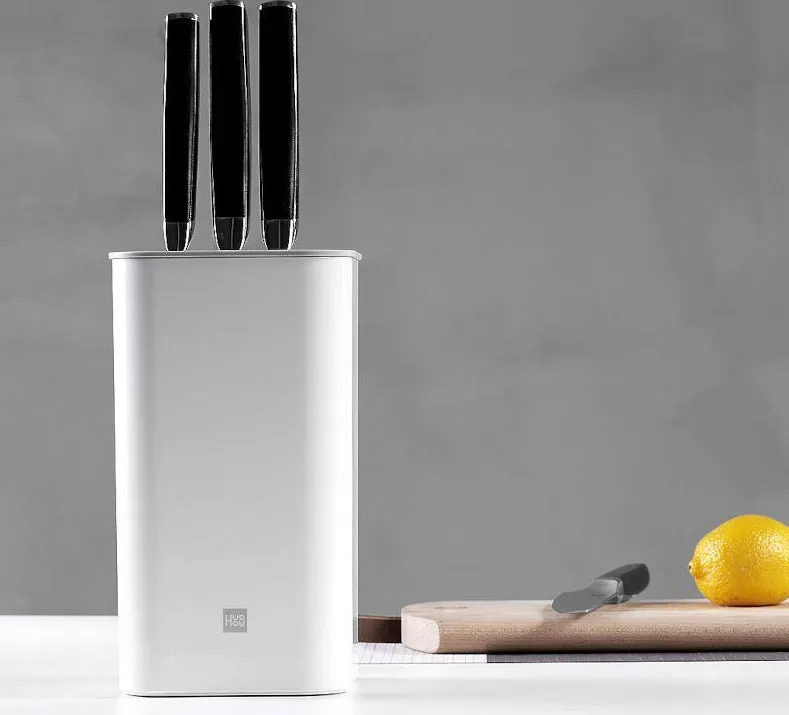 Аксессуар для хранения ножей незаменимый помощник на кухне. Хранение большого количества кухонных принадлежностей. Подходит для всех видов ножей. Компактные размеры. Надежная фиксация ножей. Пазы решетки подставки книзу расширяются и работают как эластичный рычаг, надежно удерживая ножи. Даже если ножи небольшого размера, зажимы смогут надежно фиксировать их внутри. Номер патента: ZL 2013 2 0003942.6. Пищевой материал РР. Решетка изготовлена из пищевого материала РР (полипропилена), который имеет превосходную ударопрочность и устойчивость к воздействию тяжести. Пищевой материал PP обладает высокой термостойкостью, что позволяет проводить стерилизацию в кипящей воде, а также низкой влагопроницаемостью, сохраняя поверхность ножей чистой в течение длительного времени. АБС-пластик Корпус подставки изготовлен из прочного и гибкого ABS-пластика. Корпус имеет гладкую поверхность с зеркальным эффектом, что делает его более красивым и ярким. ABS обладает превосходными механическими свойствами, высокой ударопрочностью и стойкостью к износу, поэтому корпус подставки нелегко деформировать и поцарапать. В отличие от стандартного расположения пазов, пазы решетки от Huo Huo сделаны различной ширины, для удобной установки ножей в зависимости от толщины лезвия, что не только позволяет максимально использовать пространство, но в то же время комбинация ширины также может адаптироваться к большему количеству различных типов инструментов. Сбоку решетки расположены отверстие для ножниц и для заточного стержня. Аксессуар может вместить как минимум 8 типов ножей, таких как тесак, ножи для нарезки ломтиков, ножи Santoku, ножи для фруктов, ножи для стейков и т. д. Решетку подставки из материала РР можно снимать и мыть в посудомоечной машине при высокой температуре. Корпус выполненный из ABS-пластика отполирован до зеркального блеска, что позволяет легко чистить и надолго сохранить новым. Прямоугольная форма, простая и элегантная, классическое сочетание белого и серого, зеркальная и матовая, раскрывающая жизненную силу в спокойствии. Отверстия для ножниц и заточного стержня; Два отверстия снизу подставки для стекания капель воды; Противоскользящие силиконовые накладки; изысканный логотип.