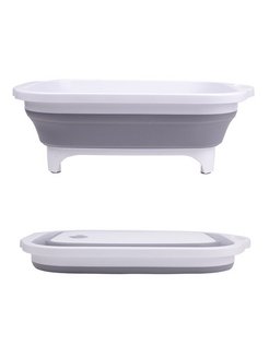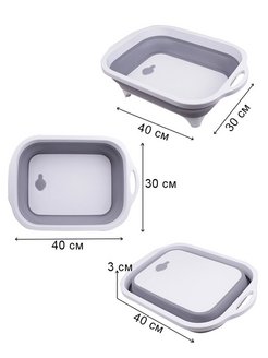 Складная корзина 4 в 1/ Разделочная доска сервировочная TAKARA NT1888. Складной тазик совмещает в себе несколько предметов! Это легкая и емкая силиконовая посуда для хранения продуктов, а так же органайзер для кухни. Ее можно использовать как дуршлаг, благодаря съемному сливу-нет необходимости поднимать и переворачивать тяжелую емкость. Удобные ручки помогут легко положить и вынуть корзину из раковины. Наличие противоскользящих ножек делает ее прочной и устойчивой. А в сложенном виде-это прочная и удобная доска для нарезки с ручками и желобами для слива соков. Кроме того, ее просто и компактно хранить, она портативна, поэтому идеальна для использования вне дома и на открытом воздухе. Изготовлена из пищевого пластика премиум-класса PP+TPR материала, без бисфенола, очень прочная, стойкая к запахам и устойчива к пятнам. Силикон высокого качества, что обеспечивает долгий срок службы и удобство в применении.