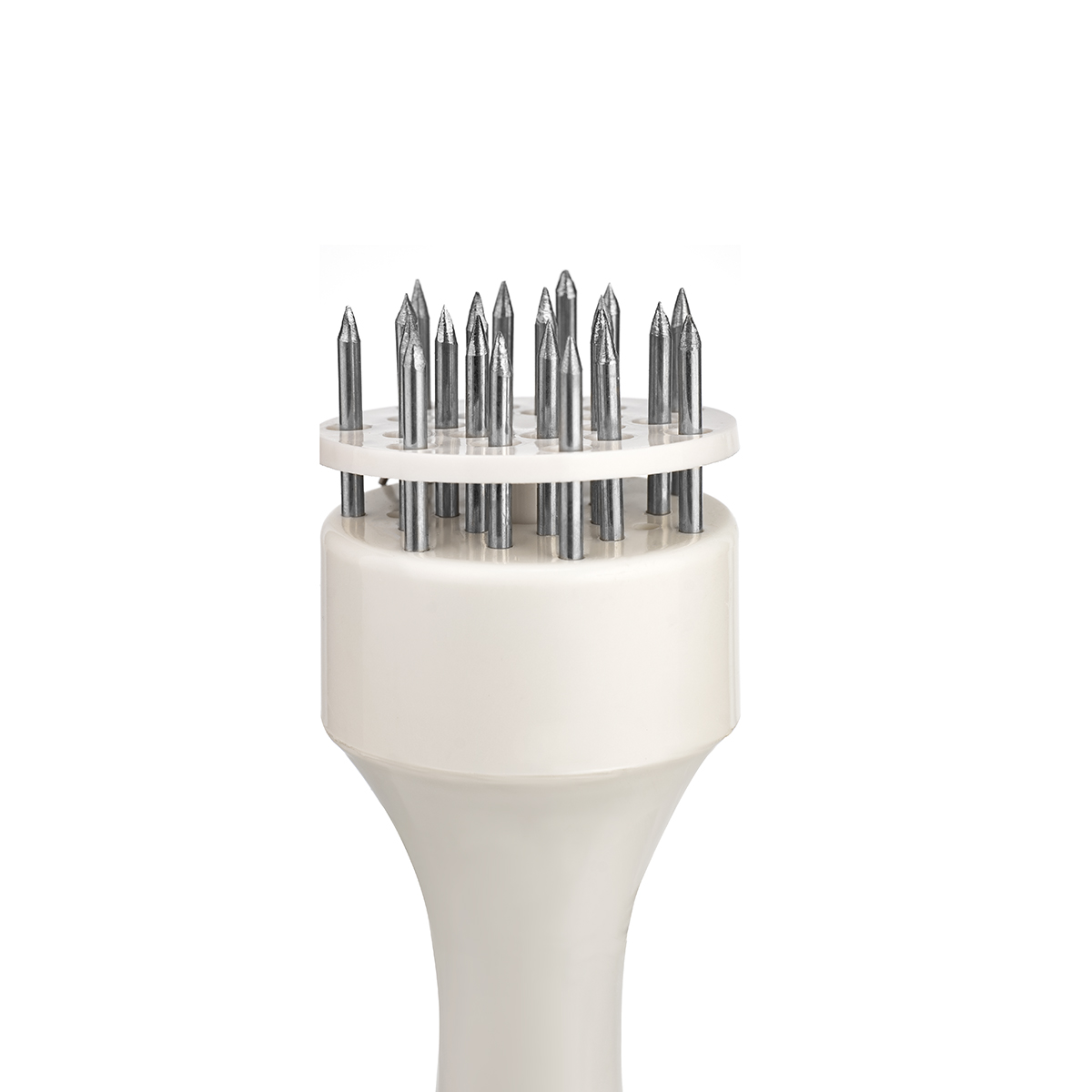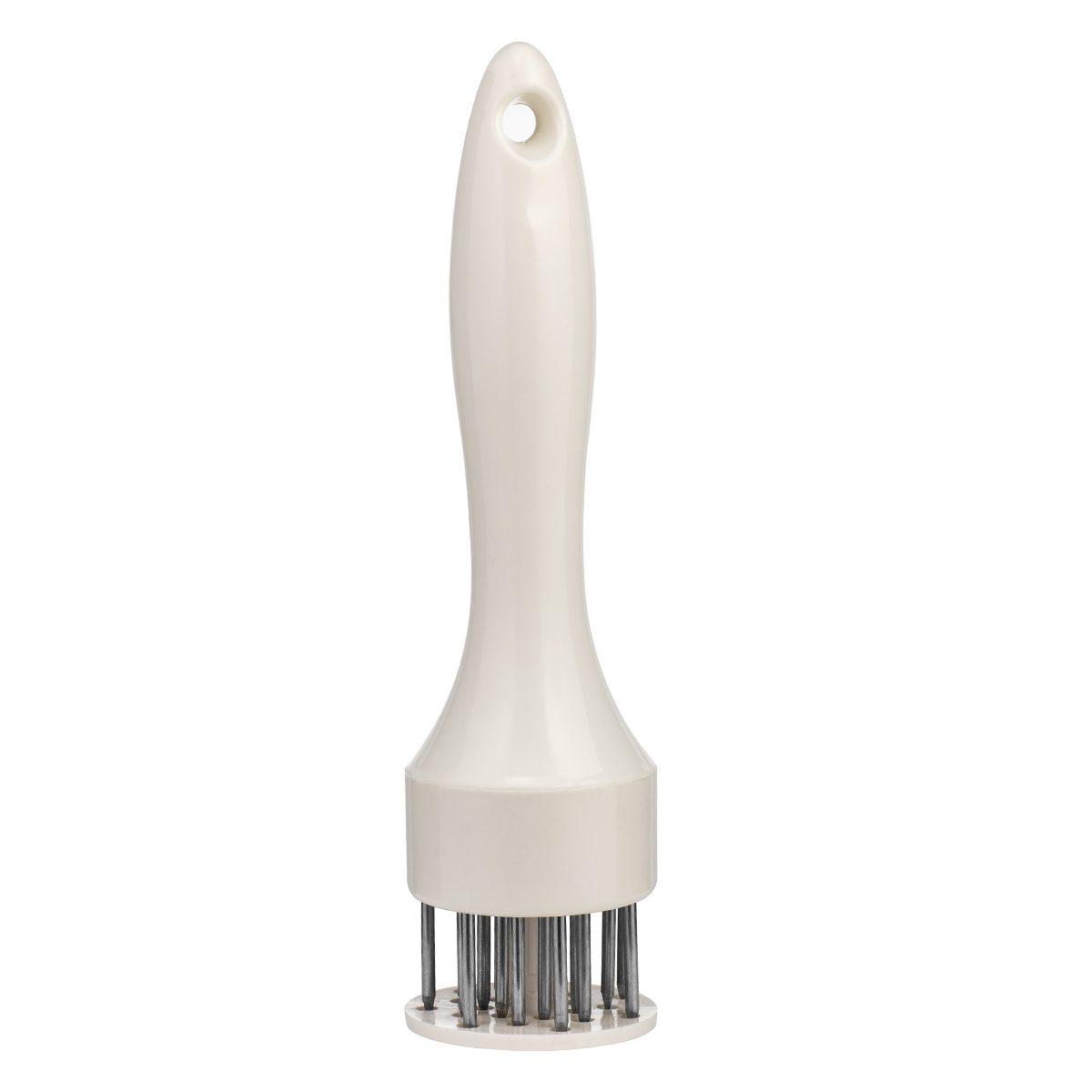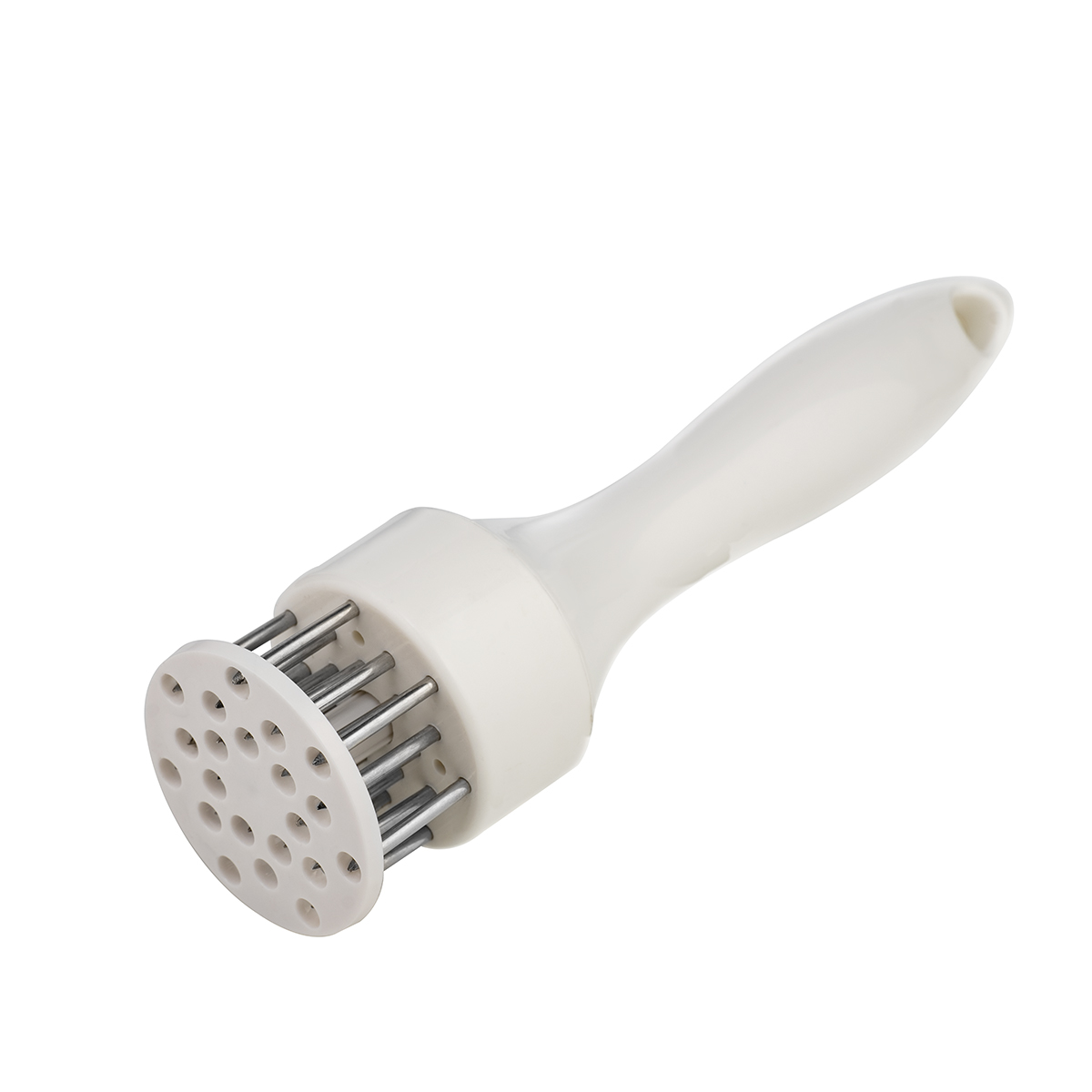 Тендерайзер (размягчитель) поможет превратить жесткое и грубое мясо в нежное и аппетитное блюдо. Острые шипы разрывают грубые волокна, и структура мяса становится мягче. Продукт готовится быстрее и проще. Защитная пластина с возвратной пружиной убережет от порезов. По сравнению с отбиванием молотком продукт не теряет своей сочности, окружающая поверхность не загрязняется, а процесс не сопровождается шумом. Рабочая часть изготовлена из стали 18/0 с повышенным содержанием никеля. На ручке имеется отверстие для подвешивания.
