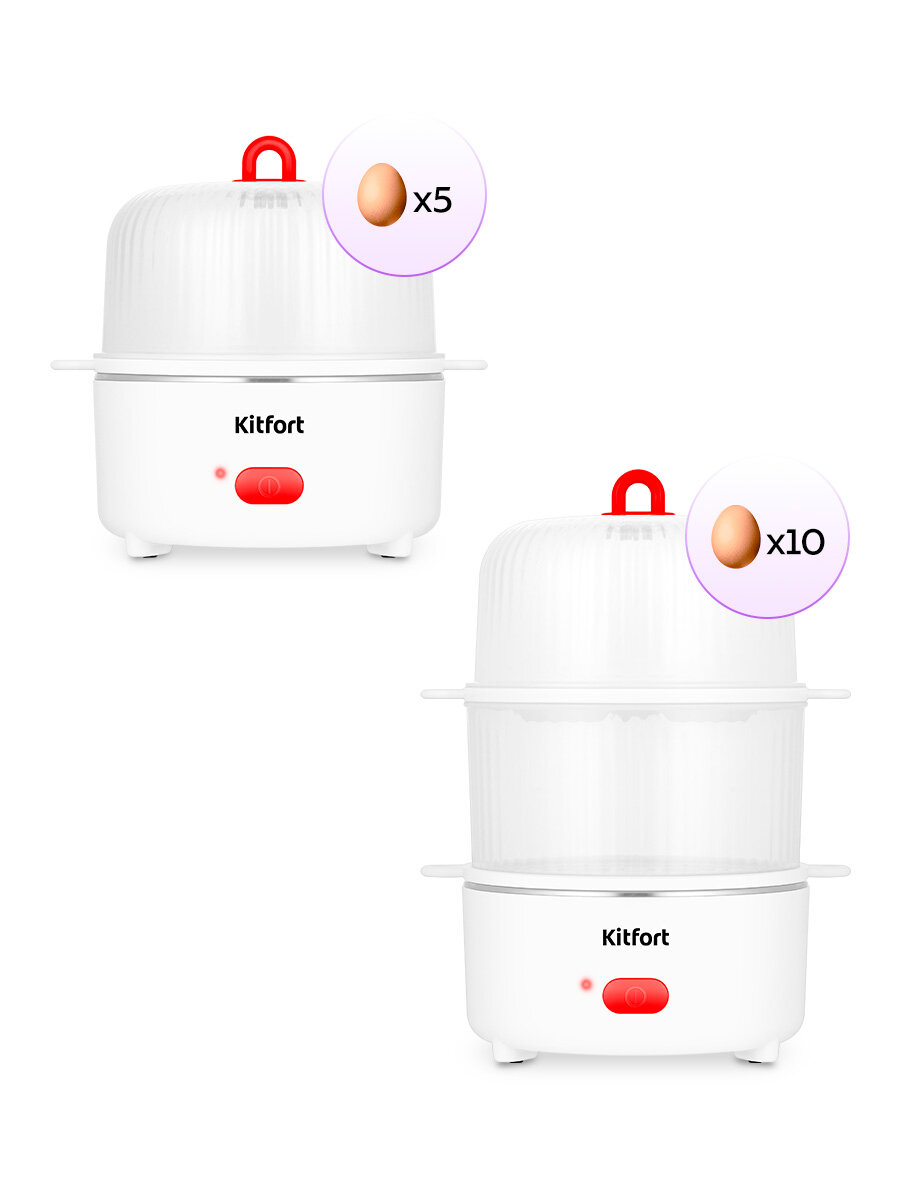 На яйцеварку устанавливается основание, которое закрывается крышкой с ручкой, чтобы готовить до 5 яиц. На основание можно установить паровой отсек, на отсек – второе основание и накрыть крышкой: так у яйцеварки будет 2 уровня для приготовления (6-10 яиц).
