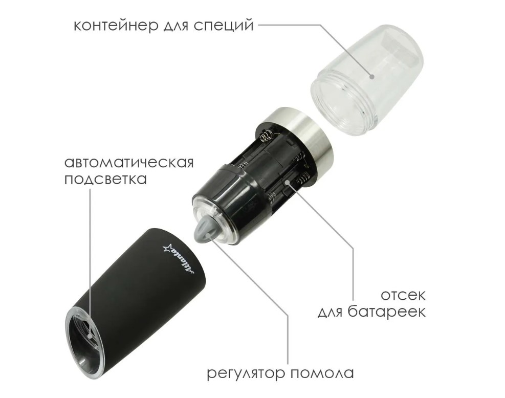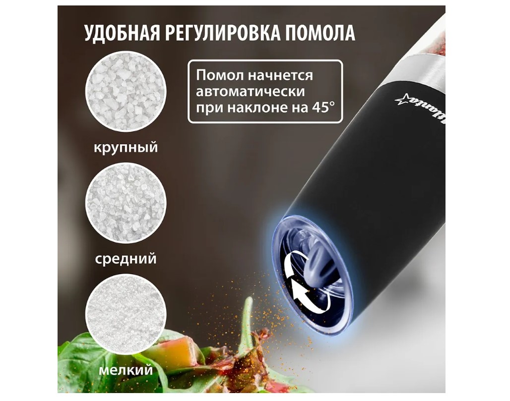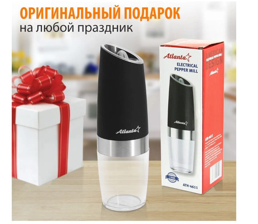 ATH-4611 (black) Мельница для специй электрическая гравитационная Atlanta - не только полезный и стильный аксессуар для кухни, но и отличный подарок на любой праздник. Корпус перечницы электрической выполнен в эргономичной форме, имеет матовое soft-touch покрытие, внутри установлен долговечный и надежный керамический механизм. Электромельница оснащена автоматическим включением при наклоне корпуса, яркой светодиодной подсветкой и регулировкой степени помола. Работает от 6 х ААА батареек. Мельница для соли и перца удачно впишется в интерьер любой современной кухни. Благодаря перцемолке Atlanta качественный и быстрый помол любых специй вам гарантирован.