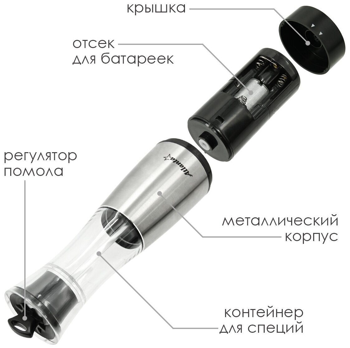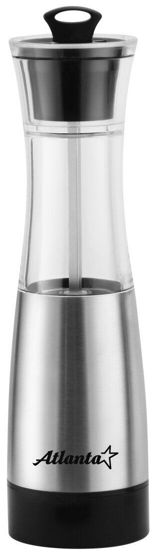 ATH-4617 (gray) Мельница электрическая для специй Atlanta станет полезным и стильным аксессуаром на вашей кухне. Буквально за несколько секунд, без каких-либо усилий вы сможете перемолоть перец, крупную соль и другие специи. Благодаря свежим специям каждое блюдо, которое вы готовите, наполнится своим неповторимым, насыщенным вкусом и оттенком. Внутри перцемолки установлен надежный керамический механизм, корпус выполнен из нержавеющей стали. Готовьте с электромельницей Atlanta и удивляйте своими кулинарными шедеврами родных и близких.