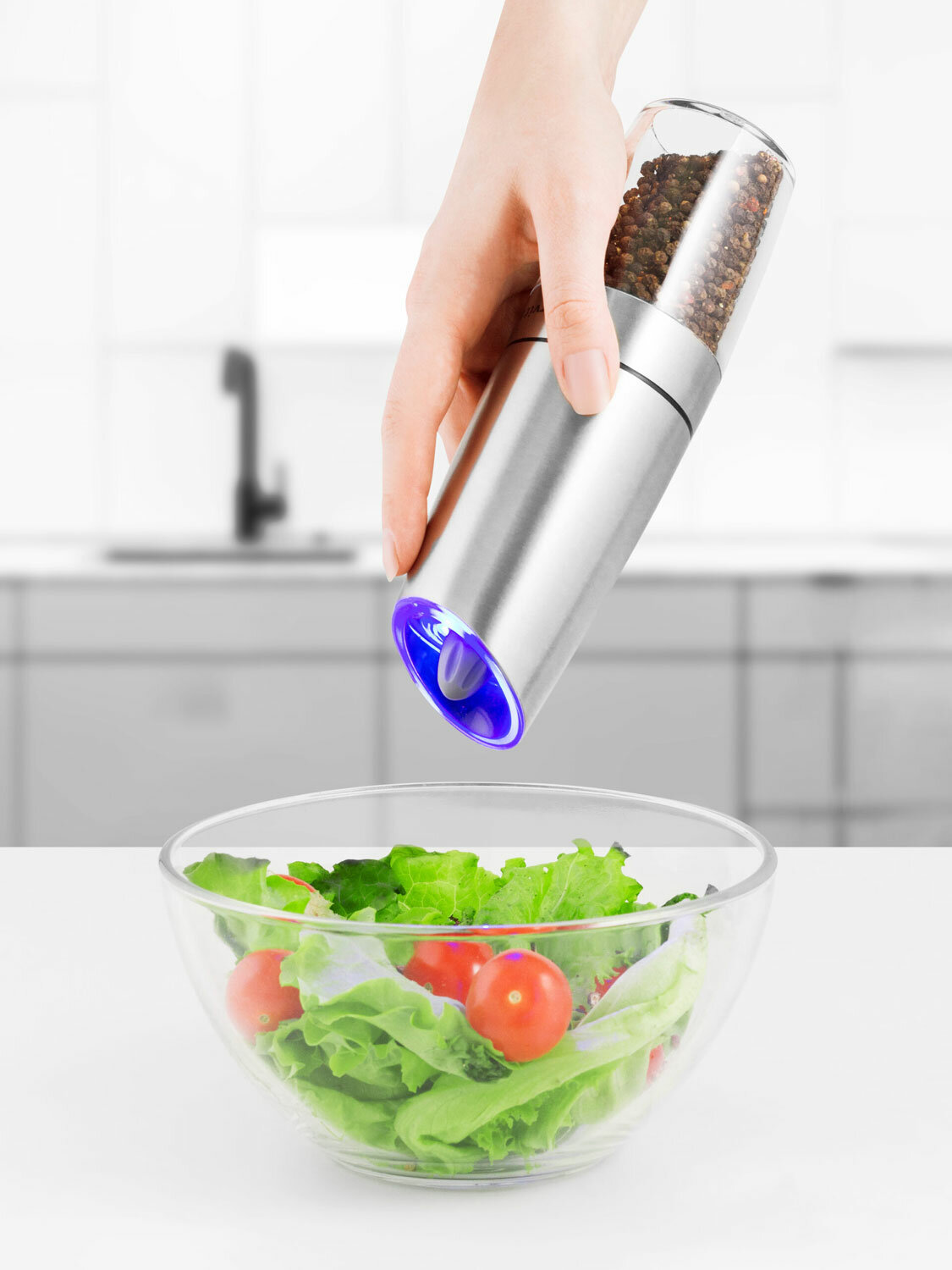 LED подсветка автоматически активируется, когда мельница начинает работать, что позволяет лучше видеть сколько специй вы добавили в блюдо.