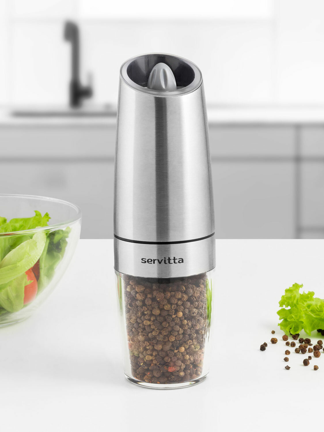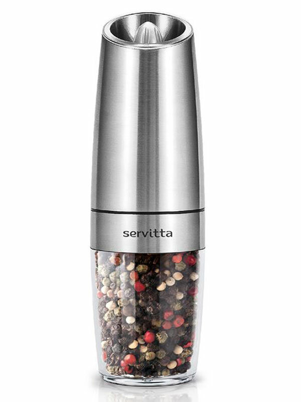 Электрическая мельница для специй, морской соли, перца и различных трав снабжена регулировкой помола (крупный, средний и мелкий помол) и подсветкой для освещения приправляемых блюд.