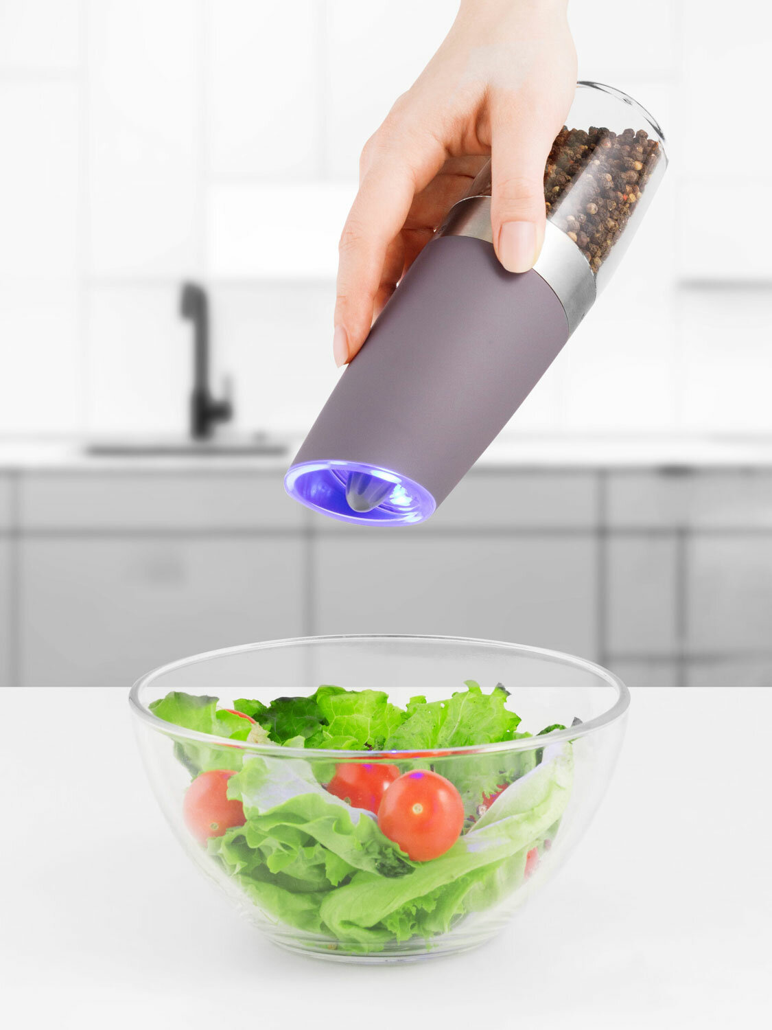 Электрическая мельница для специй, морской соли, перца и различных трав снабжена регулировкой помола (крупный, средний и мелкий помол) и подсветкой для освещения приправляемых блюд.