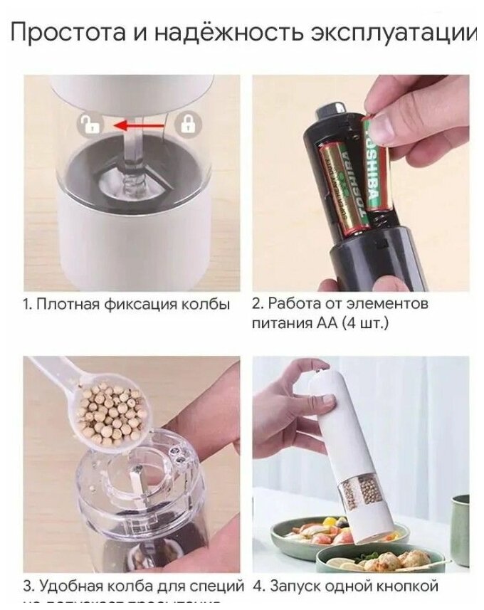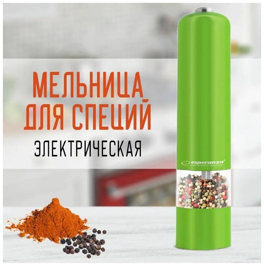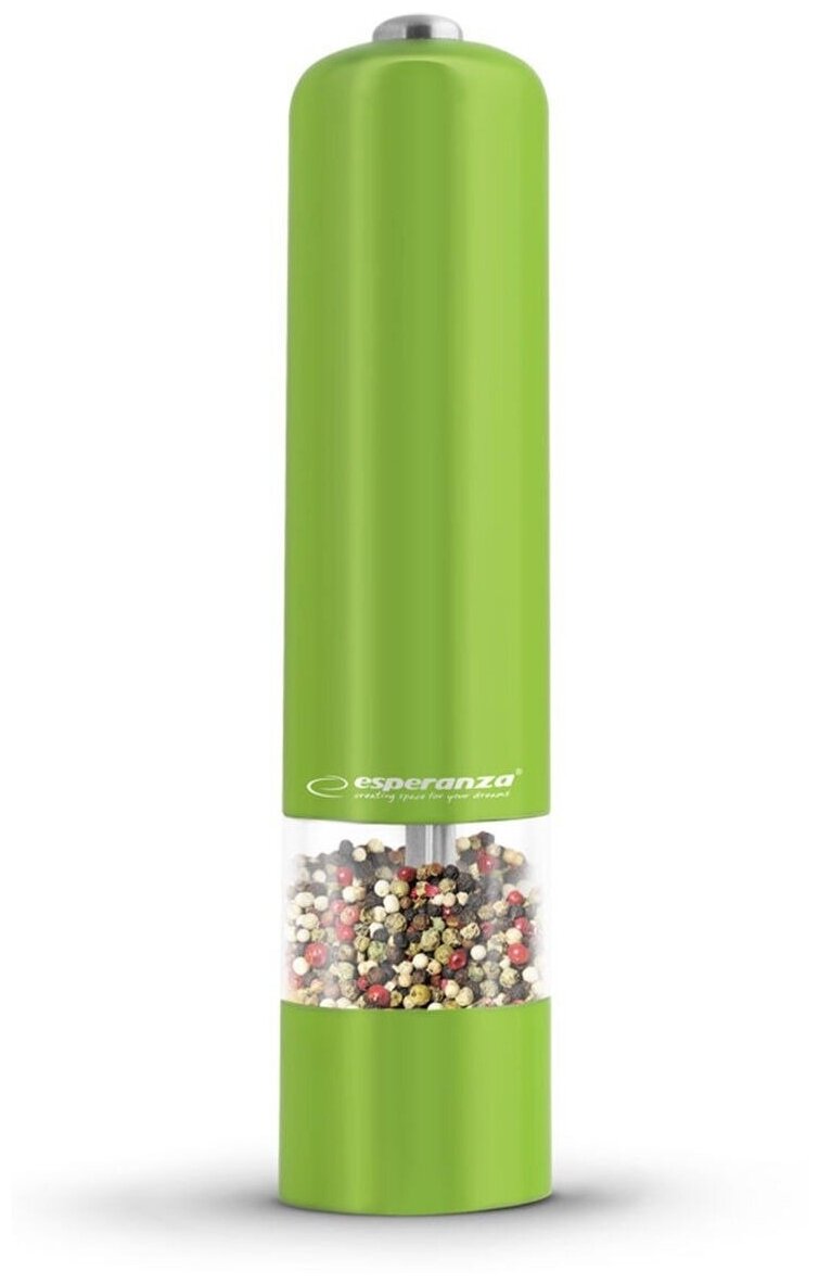 Электрическая мельница для специй Esperanza, отличный помощник на кухне для любой хозяйки. Мельница для перца и соли облегчит ежедневные действия на кухне. С помощью одной кнопки, она размелет специи в считанные секунды, а чтобы помол вышел нужного размера, предусмотрена регулировка степени помола. Также предусмотрено светодиодное освещение в ходе эксплуатации. Работает мельница от 4 батареек типа АА (батарейки в комплект не входят).