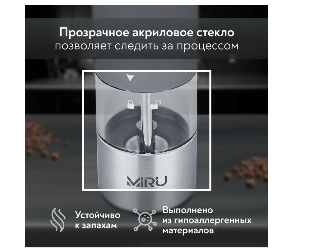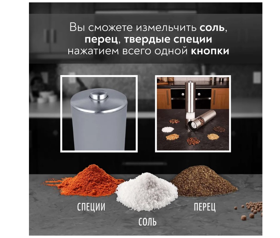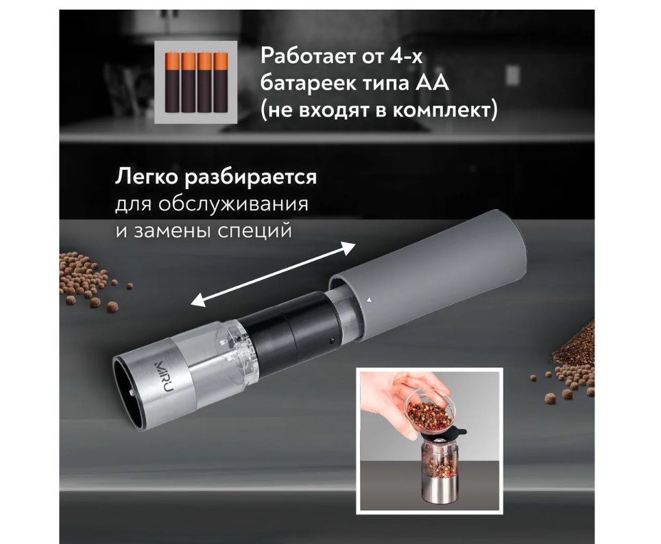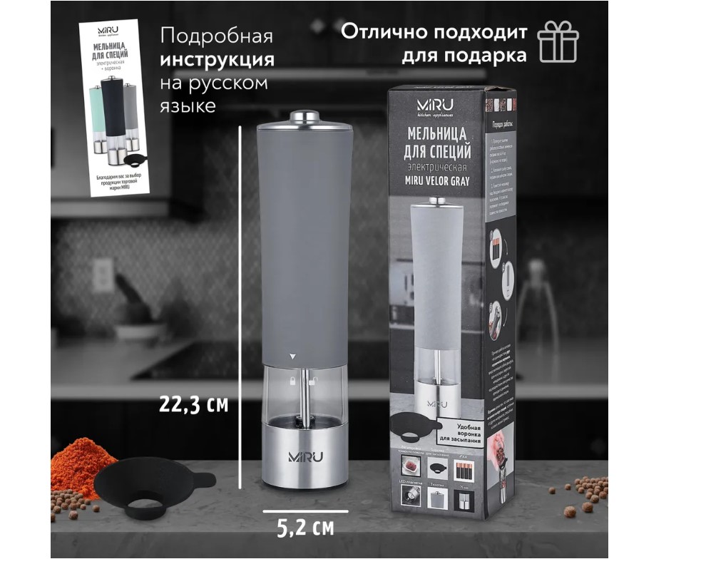 Электрическая мельница для специй MIRU станет незаменимым помощником для каждой хозяйки. Она способна с высокой эффективностью перемалывать соль, перец или набор специй. Для работы устройства необходимо вставить 4хAA батарейки (в комплект не входят), наполнить колбу специями и нажать кнопку включения. Устройство перемелет необходимое количество пряностей. Принцип работы основан на взаимодействии двух керамических жерновов, представляющих собой два круга, один из которых закреплён неподвижно, а другой под воздействием электричества приходит в движение, перемалывая специи. Керамика ценна тем, что она никак не влияет на вкус специй, в отличие от других материалов, способных оставить лёгкий привкус.