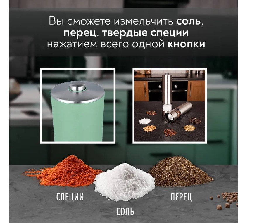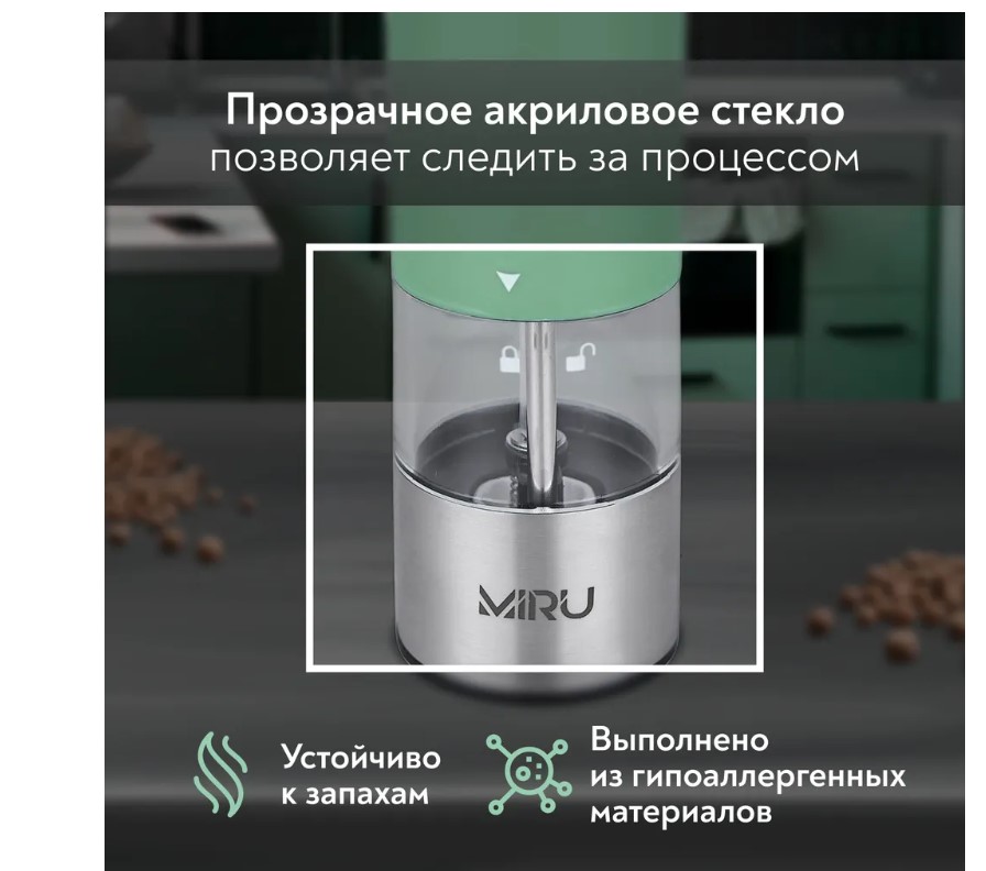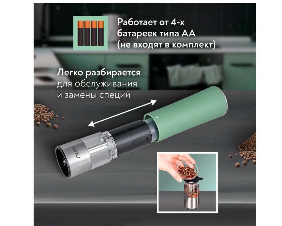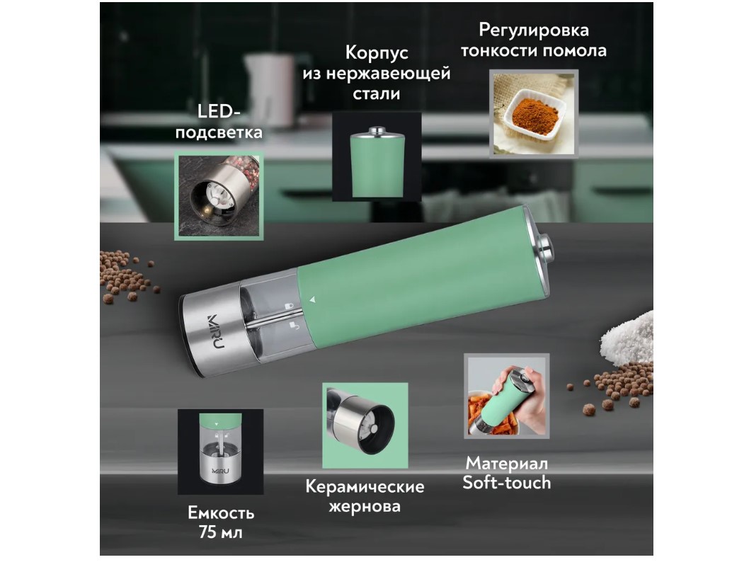 Электрическая мельница для специй MIRU станет незаменимым помощником для каждой хозяйки. Она способна с высокой эффективностью перемалывать соль, перец или набор специй. Для работы устройства необходимо вставить 4хAA батарейки (в комплект не входят), наполнить колбу специями и нажать кнопку включения. Устройство перемелет необходимое количество пряностей. Принцип работы основан на взаимодействии двух керамических жерновов, представляющих собой два круга, один из которых закреплён неподвижно, а другой под воздействием электричества приходит в движение, перемалывая специи. Керамика ценна тем, что она никак не влияет на вкус специй, в отличие от других материалов, способных оставить лёгкий привкус.