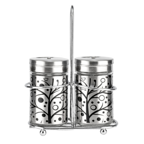Набор для специй LARA в современном дизайне – это практичный аксессуар для ежедневной сервировки стола. В комплект входит устойчивая проволочная подставка из экологичной высококачественной нержавеющей стали с матовой полировкой. Конструкция с удобным кронштейном для переноски и двумя отделениями для хранения емкостей для специй. Солонка и перечница выполнены из прозрачного стекла. Они установлены в корпус из нержавейки с прорезями для контроля уровня наполнения. Чтобы специи не выдыхались и не отсыревали, отверстия на съемных винтовых крышках можно закрыть оборудованной створкой. Можно мыть в посудомоечной машине. Узор черного цвета на корпусе.