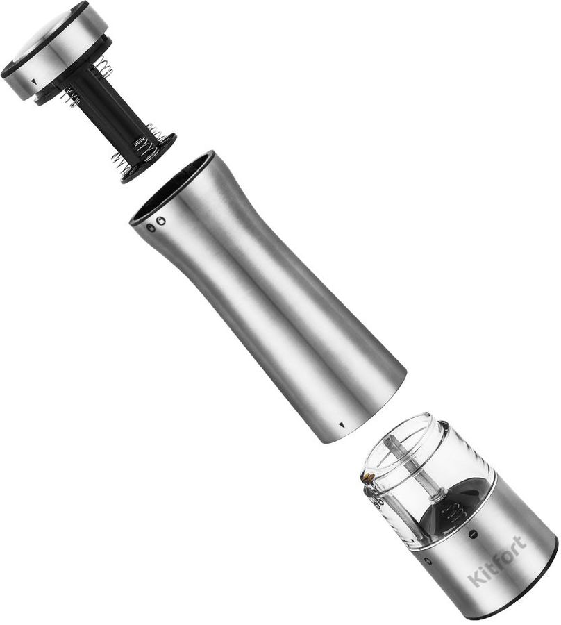Набор мельниц Kitfort KT-2029 измельчает перец-горошек, соль и другие специи. Нет нужды молоть специи впрок. Мельница одновременно мелет и дозирует. Поместите её над блюдом и просто нажмите кнопку.