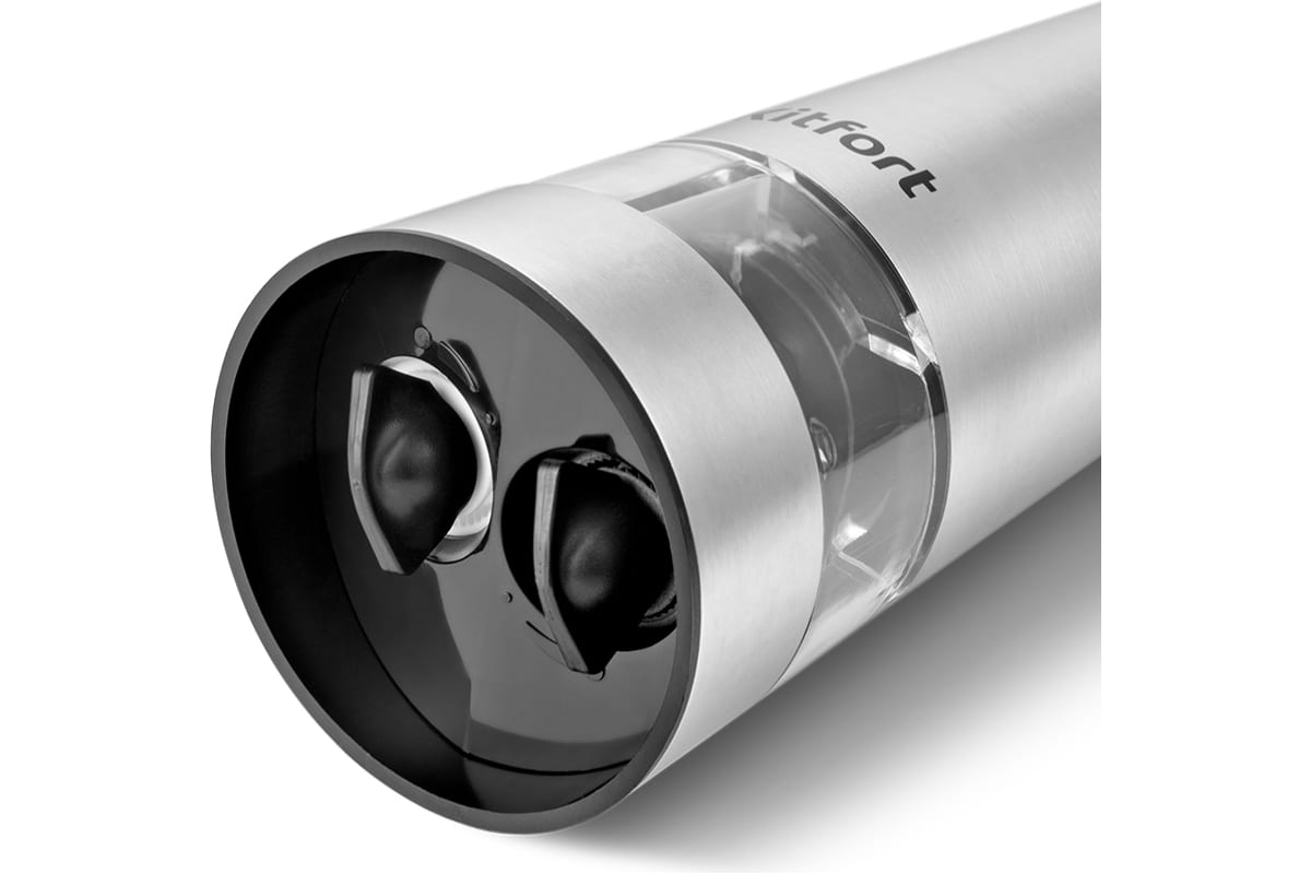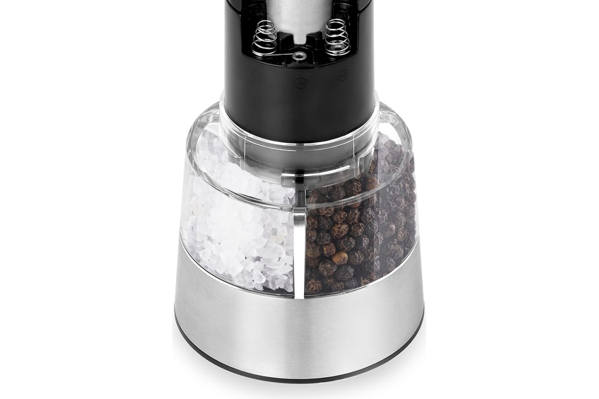 Устройство имеет конструкцию «2 в 1»: емкость для специй разделена на две части для измельчения двух видов специй. Мельница выполнена из сочетания пластика и нержавеющей стали с прозрачной емкостью для специй, что позволит следить за количеством содержимого в ней.