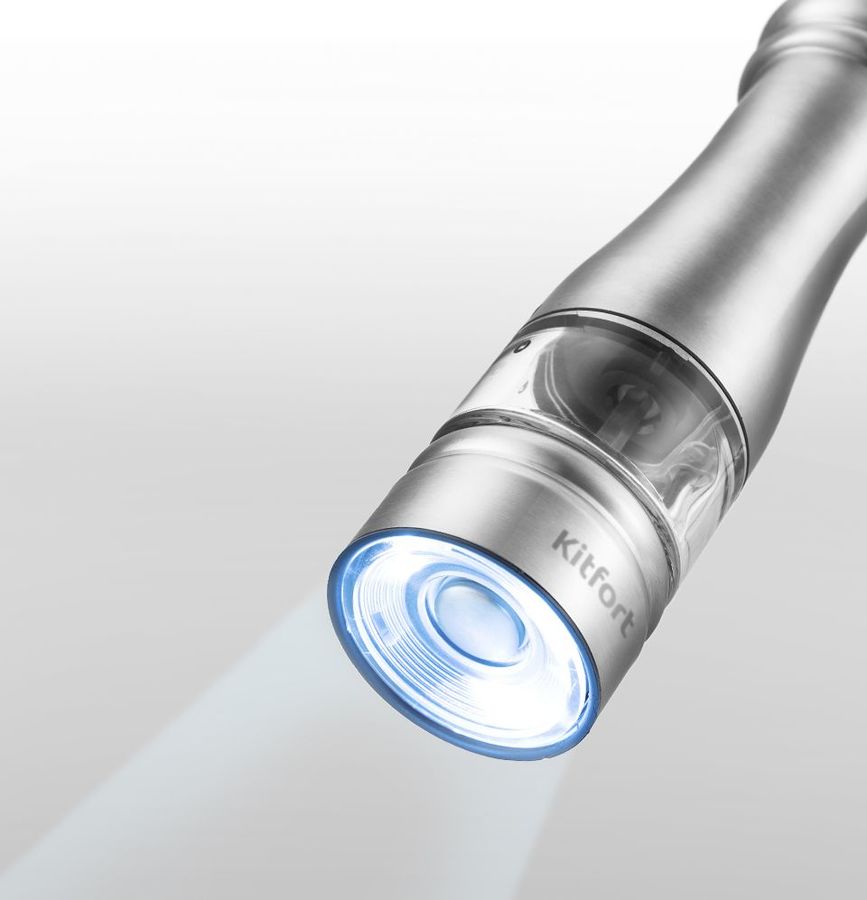 Kitfort KT-2030 измельчает перец-горошек, соль и другие специи. Нет нужды молоть специи впрок. Мельница одновременно мелет и дозирует. Поместите её над блюдом и просто нажмите кнопку.