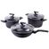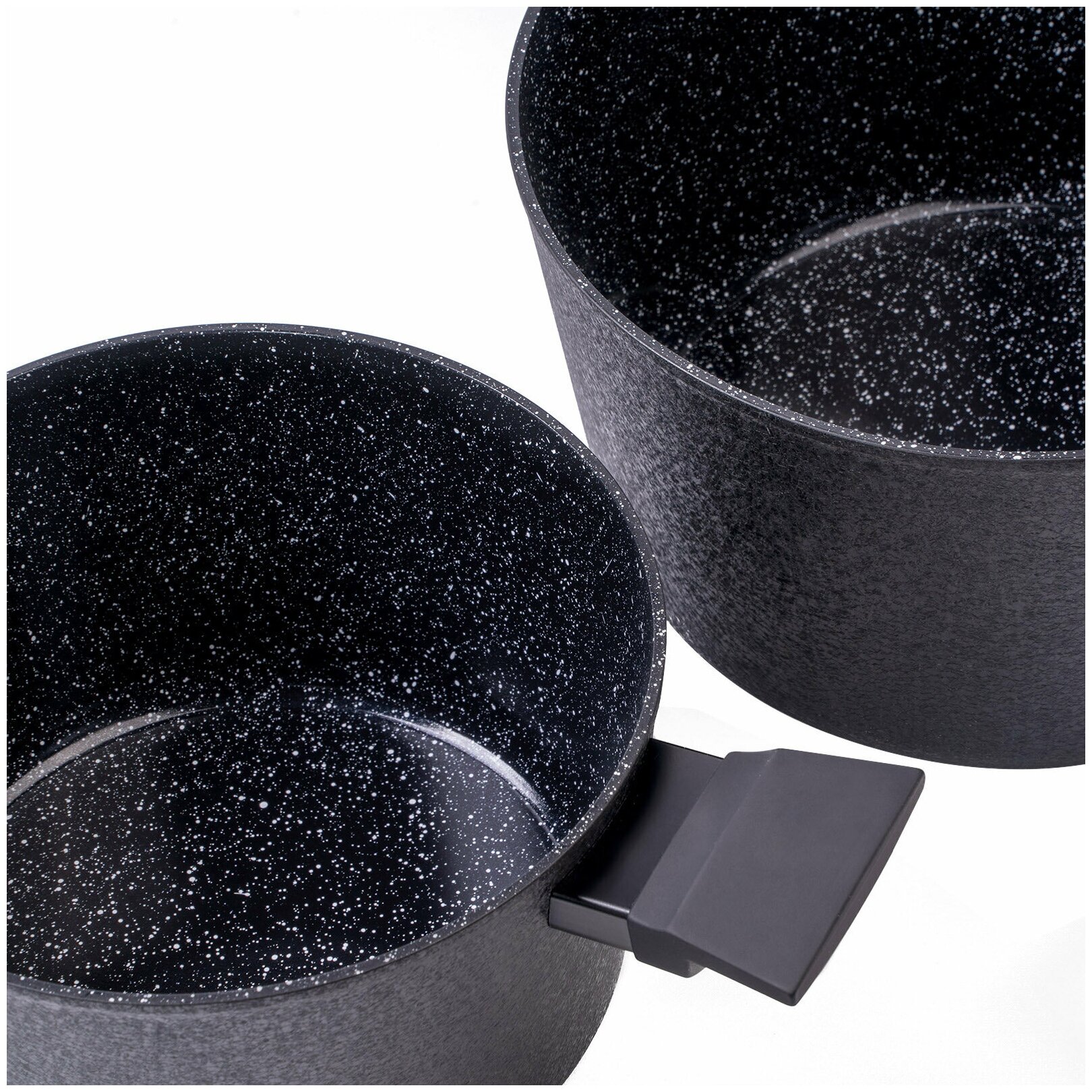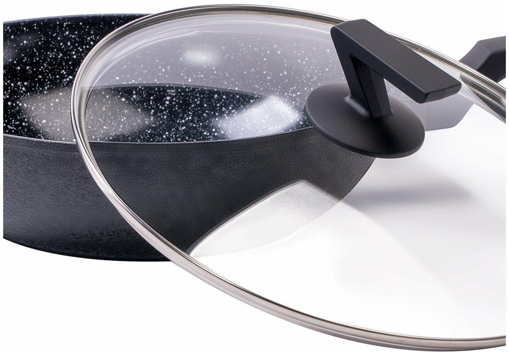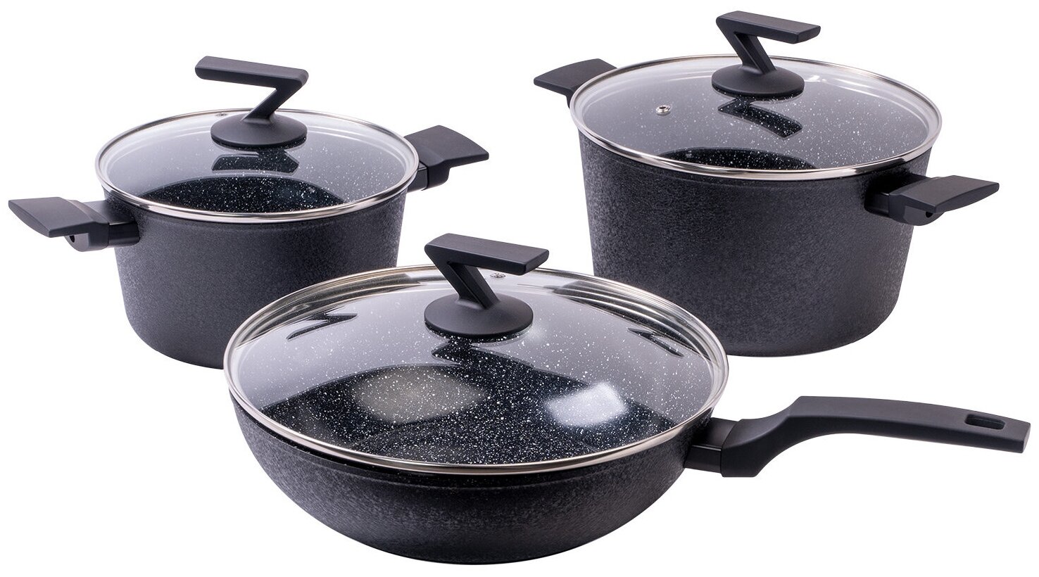 керамическое мраморное покрытие EXCILON, крышки из термостойкого стекла, бакелитовые ручки с покрытием Soft-Touch, термоаккумулирующее дно (подходит для всех типов плит, в т.ч. индукционных)
