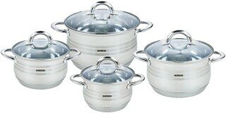 Комплектация:кастрюля со стеклянной крышкой 18см/2,8 л; кастрюля со стеклянной крышкой 20см/3,6 л; кастрюля со стеклянной крышкой 24 см/6,1 л; кастрюля со стеклянной крышкой 26/ 7,8 л