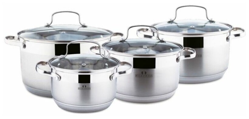 Комплектация:кастрюли с крышкой 16x10.5 см, 2.1л . Кастрюля с крышкой 18x11.5 см, 2.9 л 20x12.5 см, 3.9 л 24x14.5 см, 6.6 л