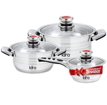 | Комплектация | Кастрюля с крышкой 4.2 л 22 х 11 см. Кастрюля с крышкой 2.3 л 18 х 9 см. Сотейник 1.6 л 16 х 8 см. | |