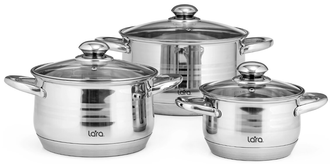 3 кастрюли: 2.1 л, 3.9 л, 6.5 л; 3 крышки