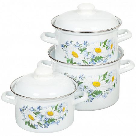 цилиндрические кастрюли, диаметр/высота стенок/объем: 160x90 мм (1.5 л), 180x100 мм (2 л), 200x112 мм (3 л); двойной слой эмали