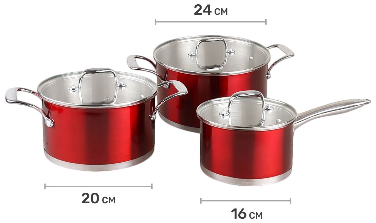Состав набора кастрюля- 2шт., крышка- 3 шт., ковш- 1 шт.