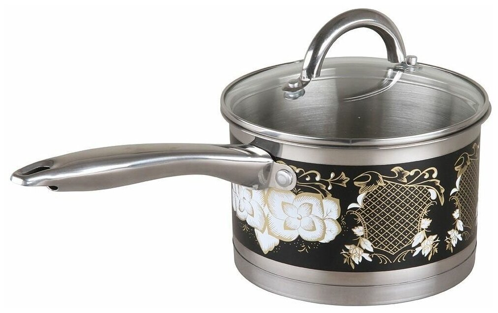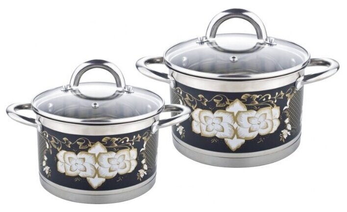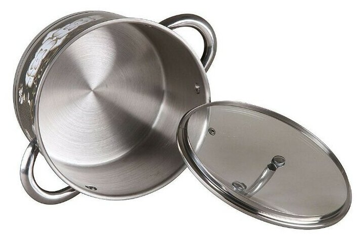 материал крышек: стекло; материал ручек: сталь; многослойное дно; мерная шкала: есть; диаметр ковша: 16 см; диаметр кастрюль: 20 см, 24 см