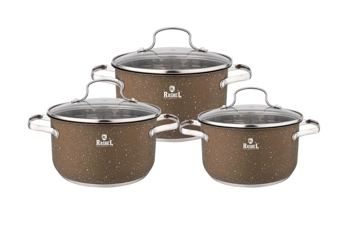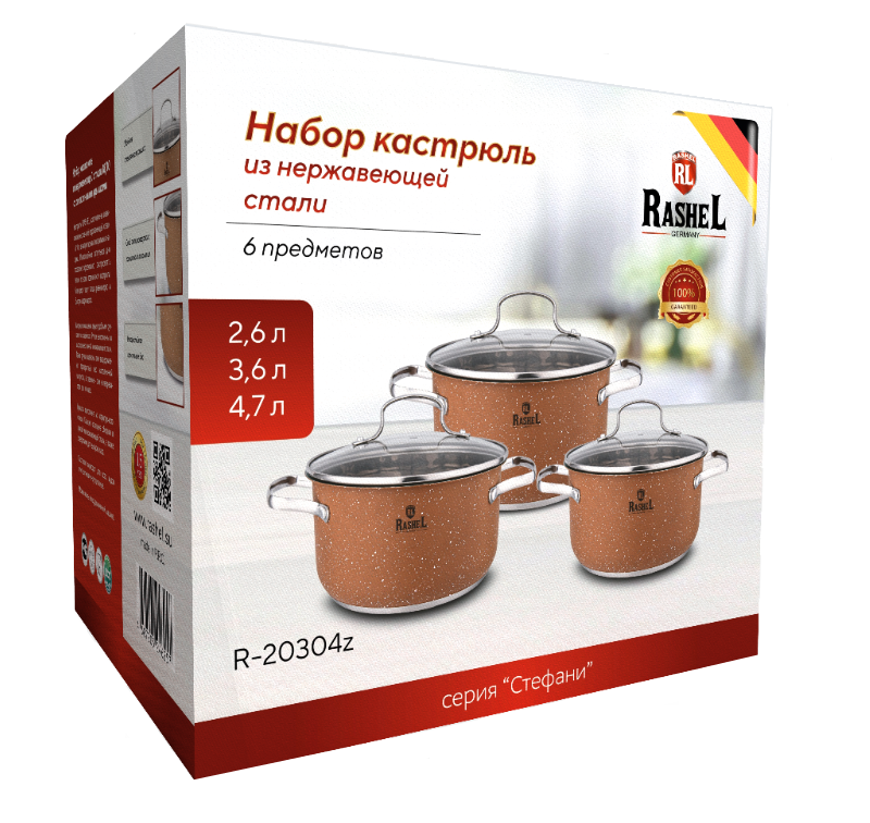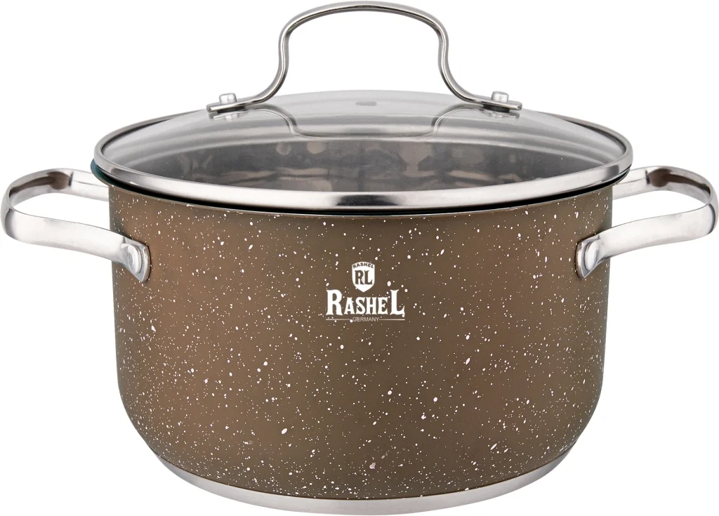 Кастрюли торговой марки "RASHEL" выполнены из высококачественной нержавеющей стали. На корпус кастрюли нанесено антипригарное гранитное покрытие. Кастрюли удобны в использовании, за ними легко и просто ухаживать. Многослойное капсульное дно равномерно распределяет тепло и долгое время сохраняет достигнутую температуру, тем самым обеспечивает равномерный нагрев и равномерную подачу тепла во внутрь кастрюли.