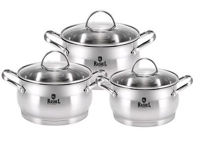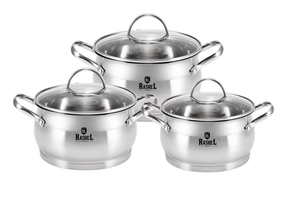 Набор кастрюль из нержавеющей стали со стеклянной крышкой выполнен из высококачественного материала 18/10 (хром/никель), что гарантирует долговечность и устойчивость к коррозии. Экологичный материал обеспечивает безопасное использование посуды на всех видах плит, включая индукционные, и помогает сохранить вкус блюд без металлических привкусов. На внутренней стороне кастрюли нанесена мерная шкала, позволяющая с легкостью контролировать объем жидкости, что упрощает процесс готовки.