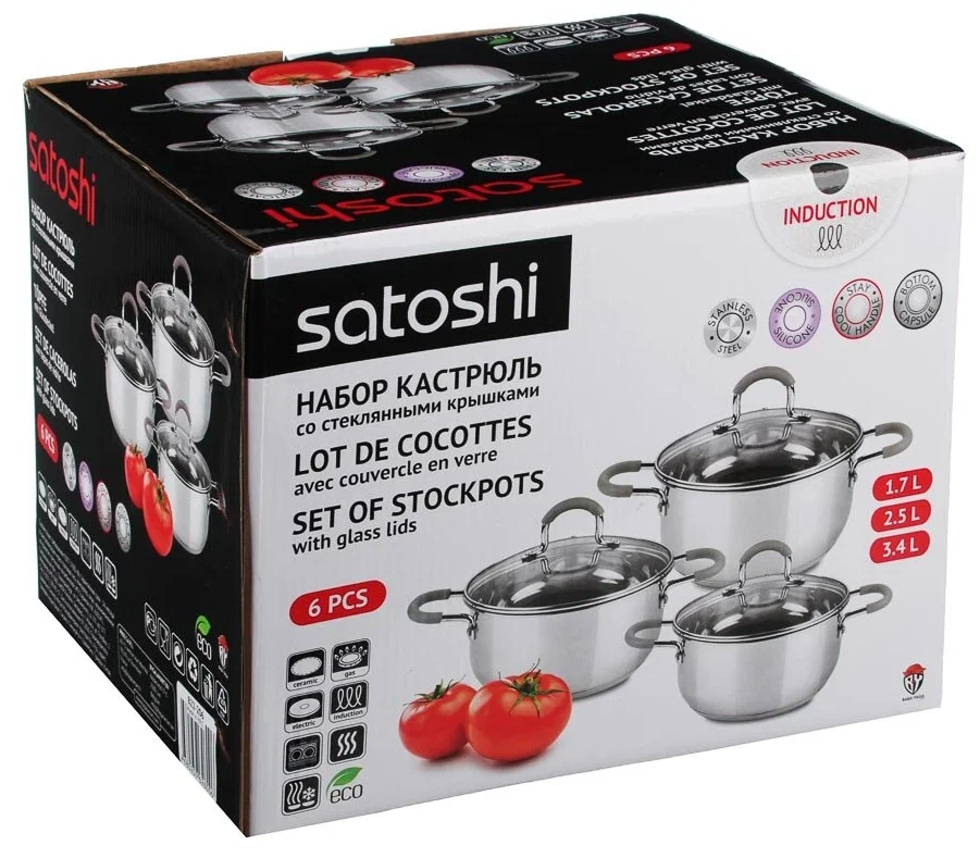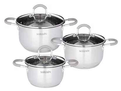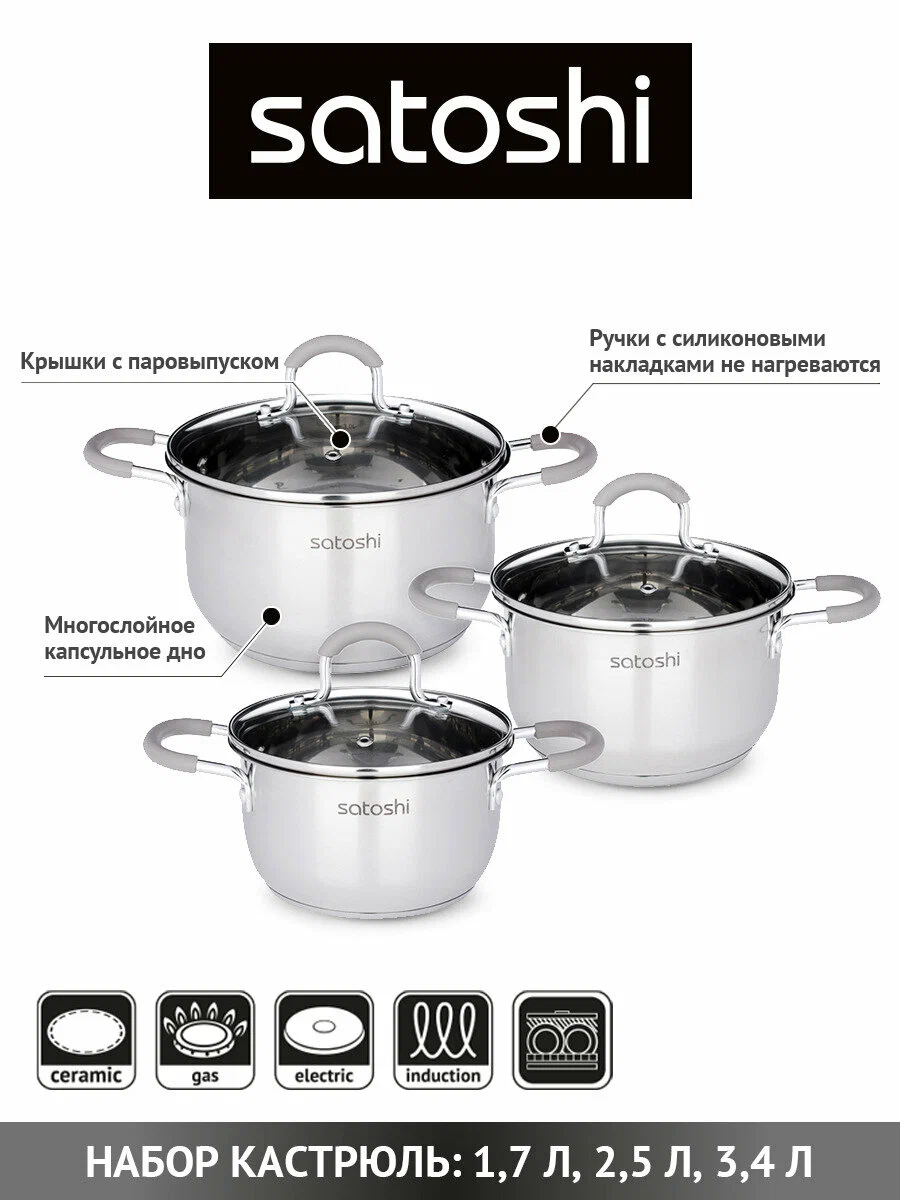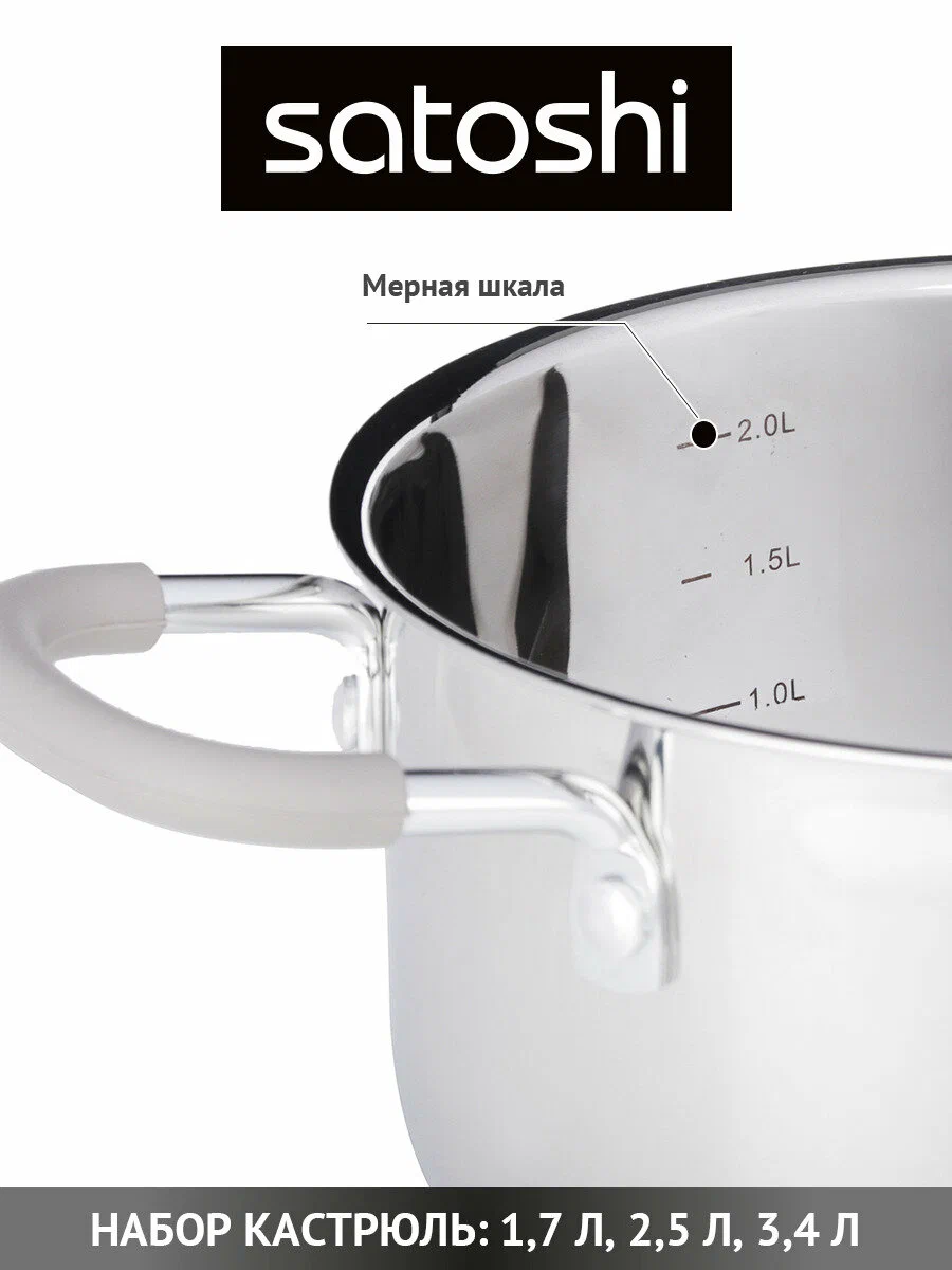 3 кастрюли: 1.7 л, 2.5 л, 3.4 л; 3 крышки