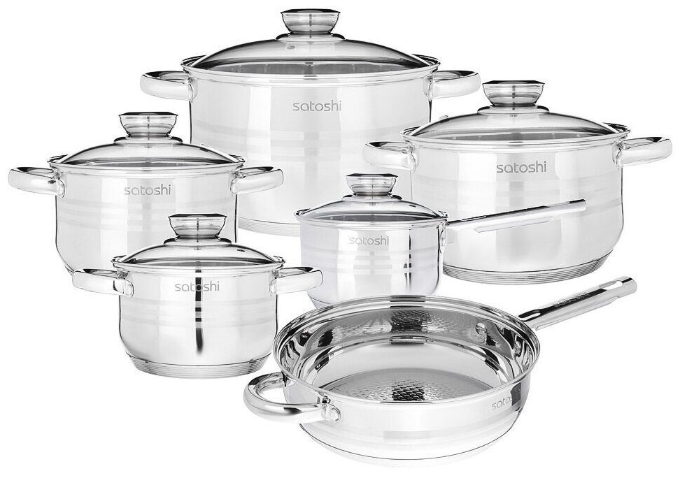 4 кастрюли: 1.9л, 2.8л, 3.7л, 6.2л; ковш: 1.9л; сковорода 24 см; 6 крышек