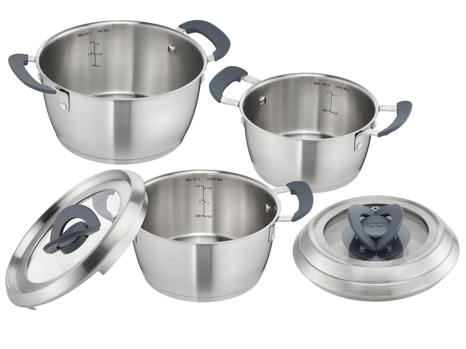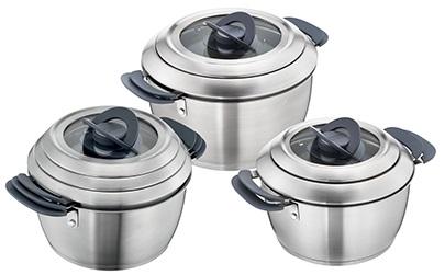 Состав комплекта: Кастрюля с крышкой 16 см 1.4 л, кастрюля с крышкой 18 см 2.1 л, кастрюля с крышкой 20 см 2.8 л.