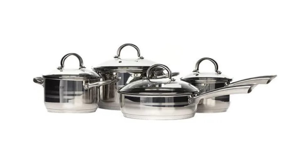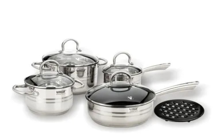 2 кастрюли: 2.6 л, 5.6 л; сотейник: 16 см; сковорода: 24 см; 4 крышки; подставка