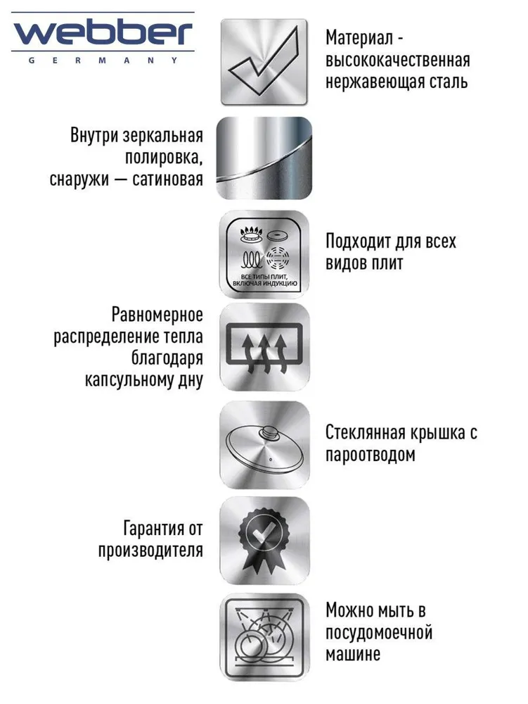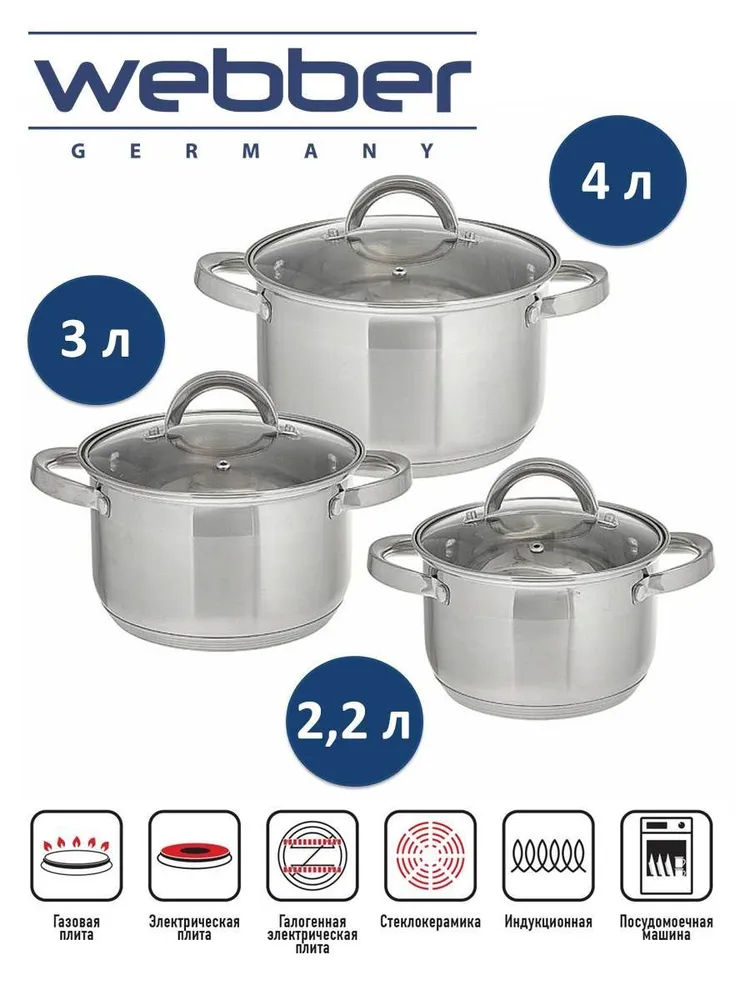 Набор кастрюль Webber BE-627/6 включает в себя шесть предметов, выполненных из прочной нержавеющей стали и стекла, устойчивого к воздействию высоких температур. Трехслойное дно отличается хорошей термоотдачей, также большая толщина стенок рабочей области минимизирует вероятность пригорания продуктов в процессе готовки. Разрешено использование посудомоечной машины для быстрого очищения загрязнений с посуды. Объем кастрюль составляет 2,2, 3 и 4 л. Возможен нагрев на любых видах плит и в духовых шкафах. Во всех крышках сделано отверстие для выпуска пара.