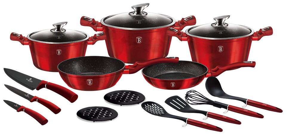 2 сковороды: 20 см, 24 см; 3 кастрюли: 2.5 л, 4.1 л, 6.1 л; 3 крышки; 3 ножа; кухонные принадлежности (4 шт.); 2 подставки