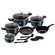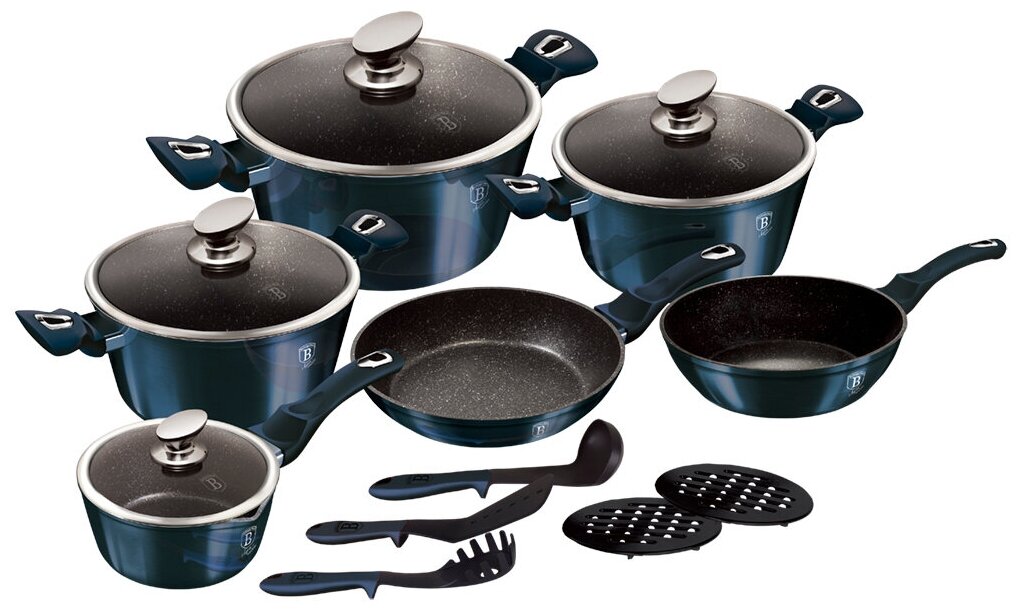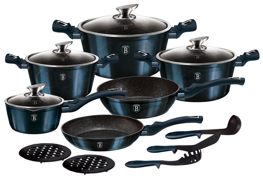 ковш: 16 см; кастрюли: 2.5 л, 4.1 л, 6.1 л; сковорода: 28 см; сотейник: 24 см; 4 крышки; 2 бакелитовые подставки; кухонные принадлежности (3 шт.)