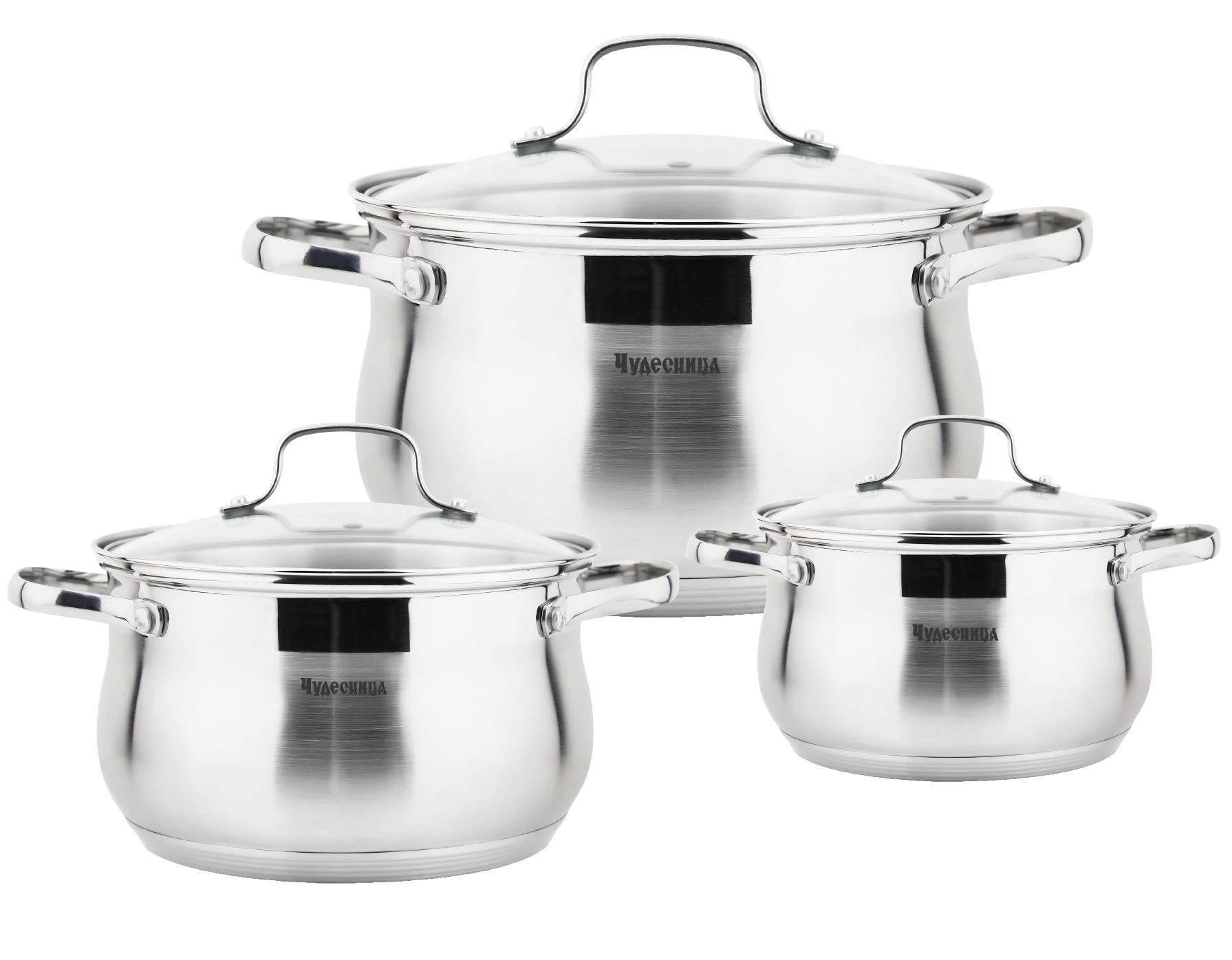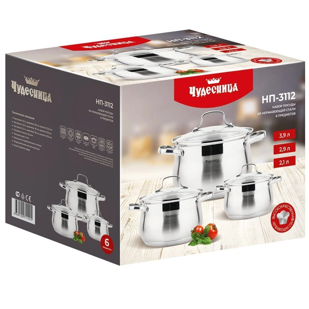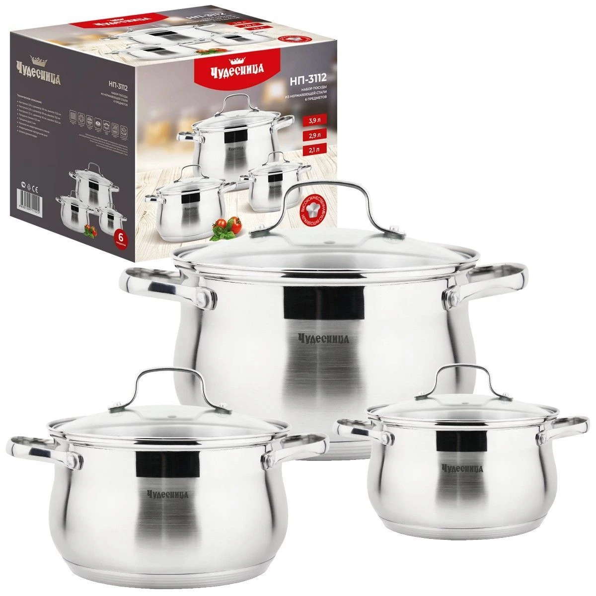 Набор посуды из нержавеющей стали Чудесница НП-3112, кастрюли 2,1л (16*10,5см), 2,9л (18*11,5см), 3,9л (20*12,5 см), нержавеющая сталь 18/10, крышка из жаропрочного стекла с отверстием для выхода пара, 5-ти слойное капсулированное теплоаккумулирующее индукционное дно 5см, толщина стенок 0,5 мм, шкала уровня воды.