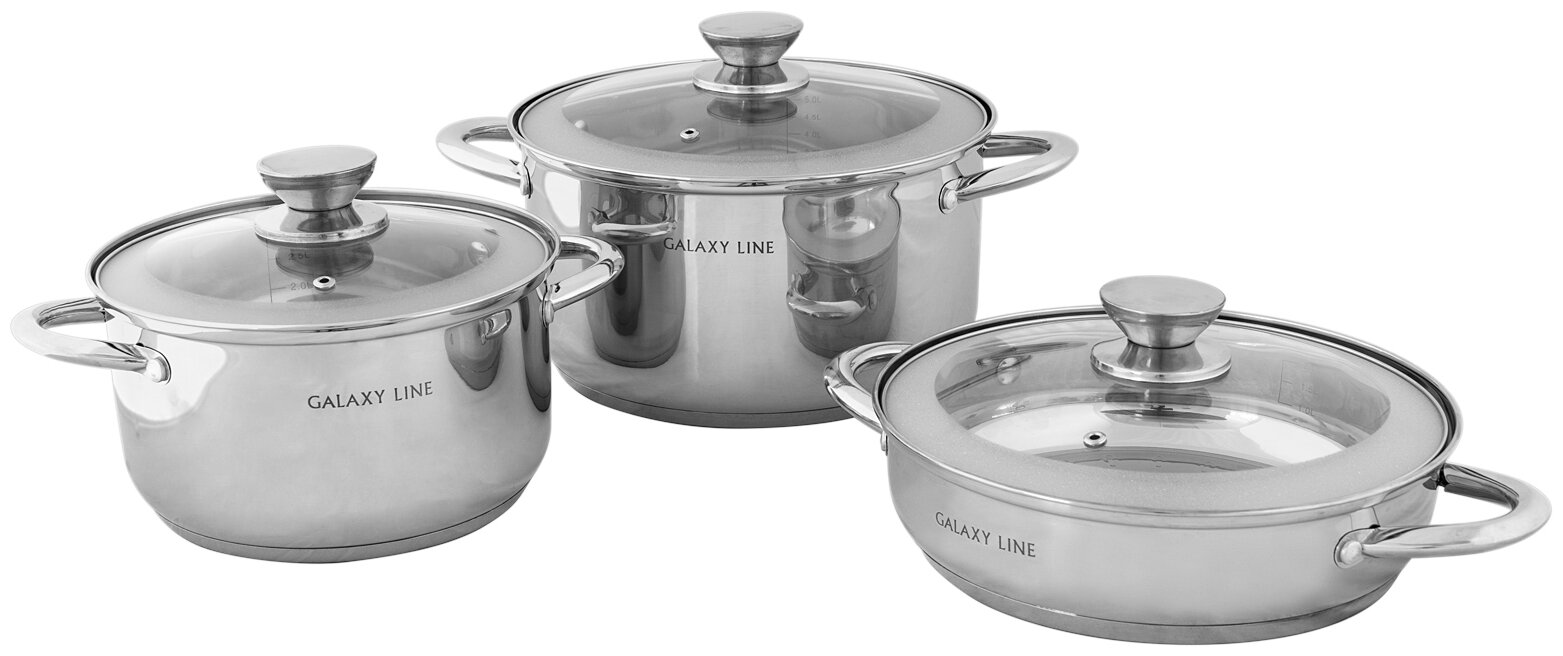 кастрюли: 3.6 л, 6.1 л; сотейник: 2.9 л; 3 крышки