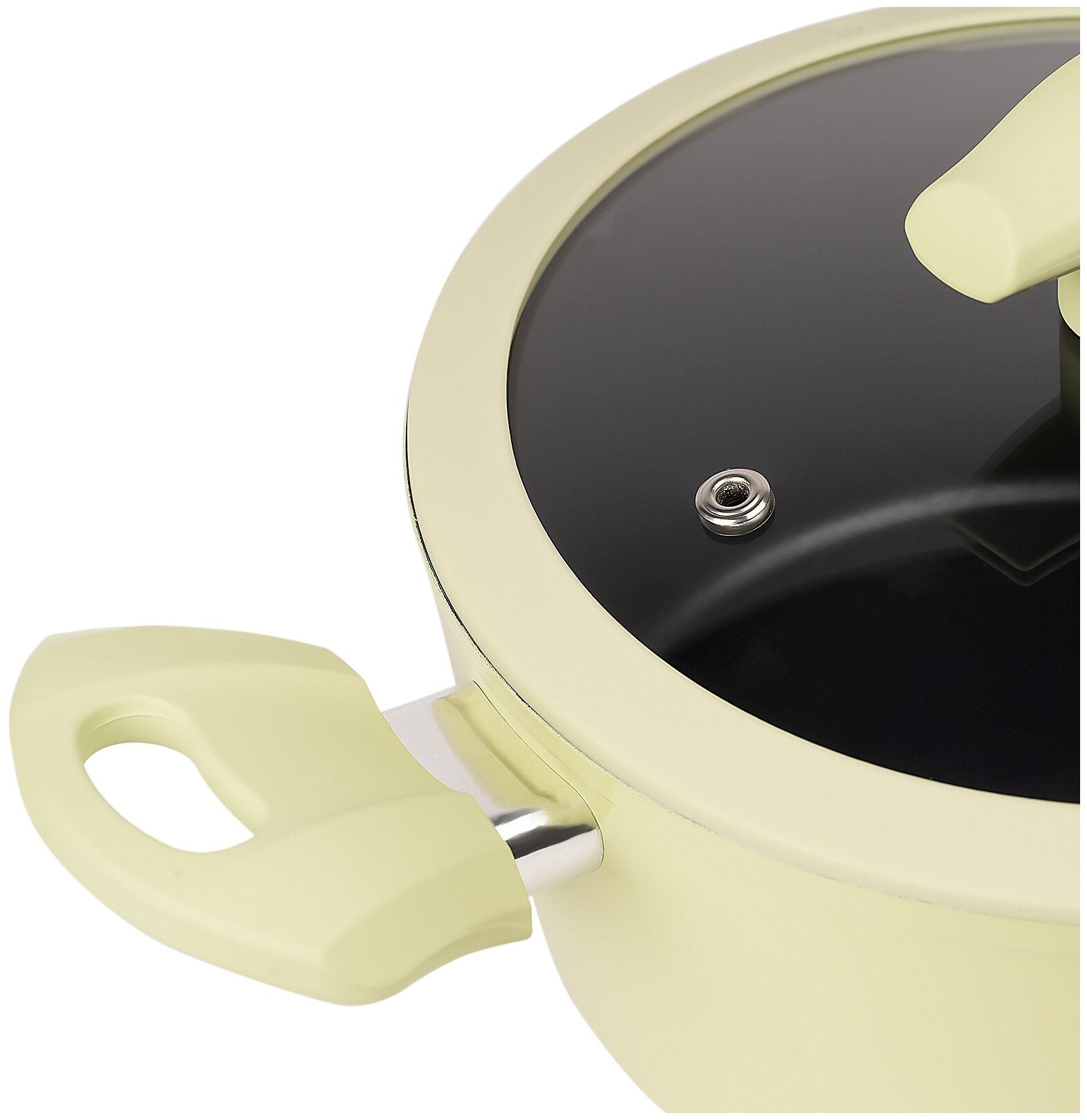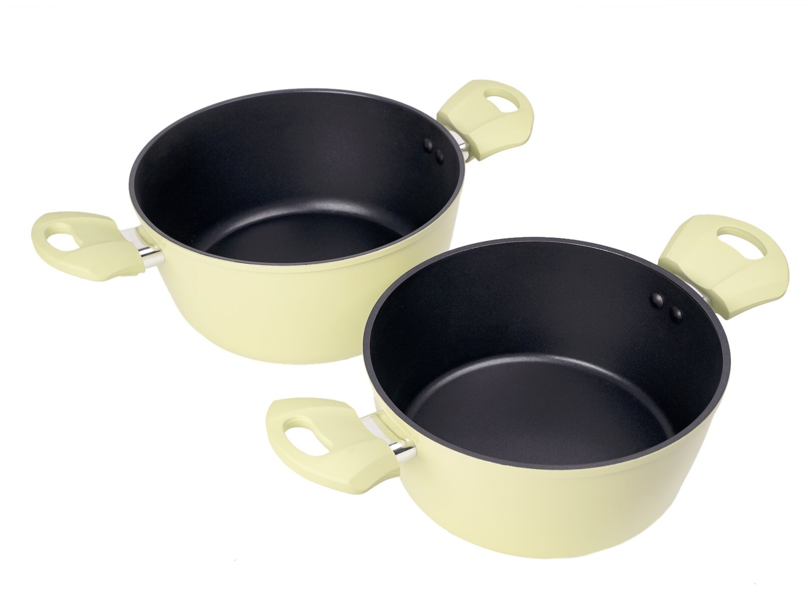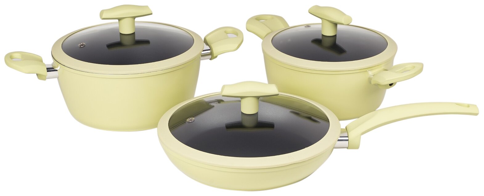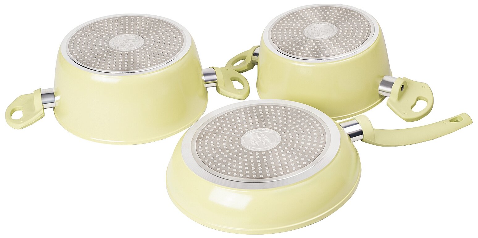 кастрюля 3 л (22 х 10 см), диаметр индукционного дна – 16,2 см; кастрюля объемом 2,3 л (20 х 9 см), диаметр индукционного дна – 14,7 см; сковорода 24 х 4,5 см, диаметр индукционного дна – 16,2 см; крышки из термостойкого стекла с силиконовым ободком и отверстием для выхода пара; ручки с покрытием «Soft-touch»