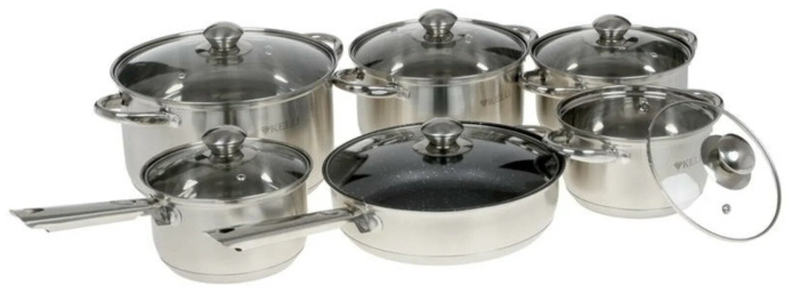 ковш: 2 л; кастрюли: 2 л, 2.6 л, 3.6 л, 6.1 л; сковорода: 24 см; 6 крышек