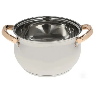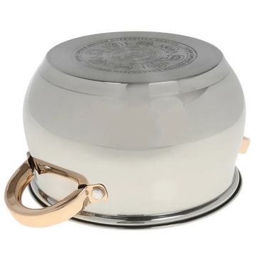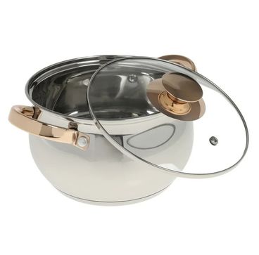 Набор посуды предусматривает наличие шести предметов – трех кастрюль и крышек, соответствующих их диаметру. Объем кастрюль очень удобен для средней семьи для ежедневного приготовления пищи: 2.1 л, 3 л и 4 л. Изготовленные из нержавеющей стали, изделия станут лучшими для своих владельцев, поскольку будут радовать не один год своим качественным исполнением. Кастрюли выполнены в серебристом цвете и дополнены золотистыми ручками, на которых акцентировано внимание.