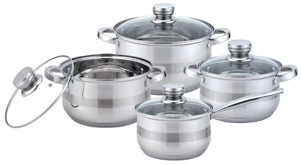 диаметр ковша: 160 мм, диаметр кастрюль: 180 мм, 200 мм, 220 мм, пятислойное дно, зеркальная поверхность с матовой полосой, клепаные ручки не нагреваются