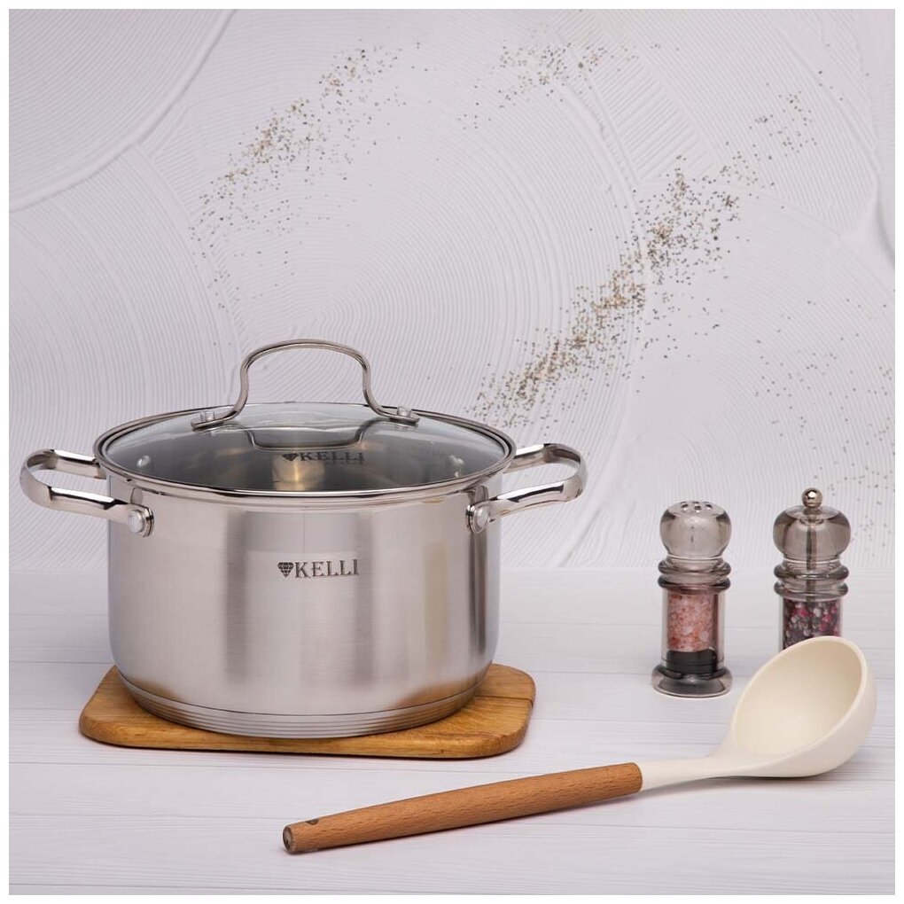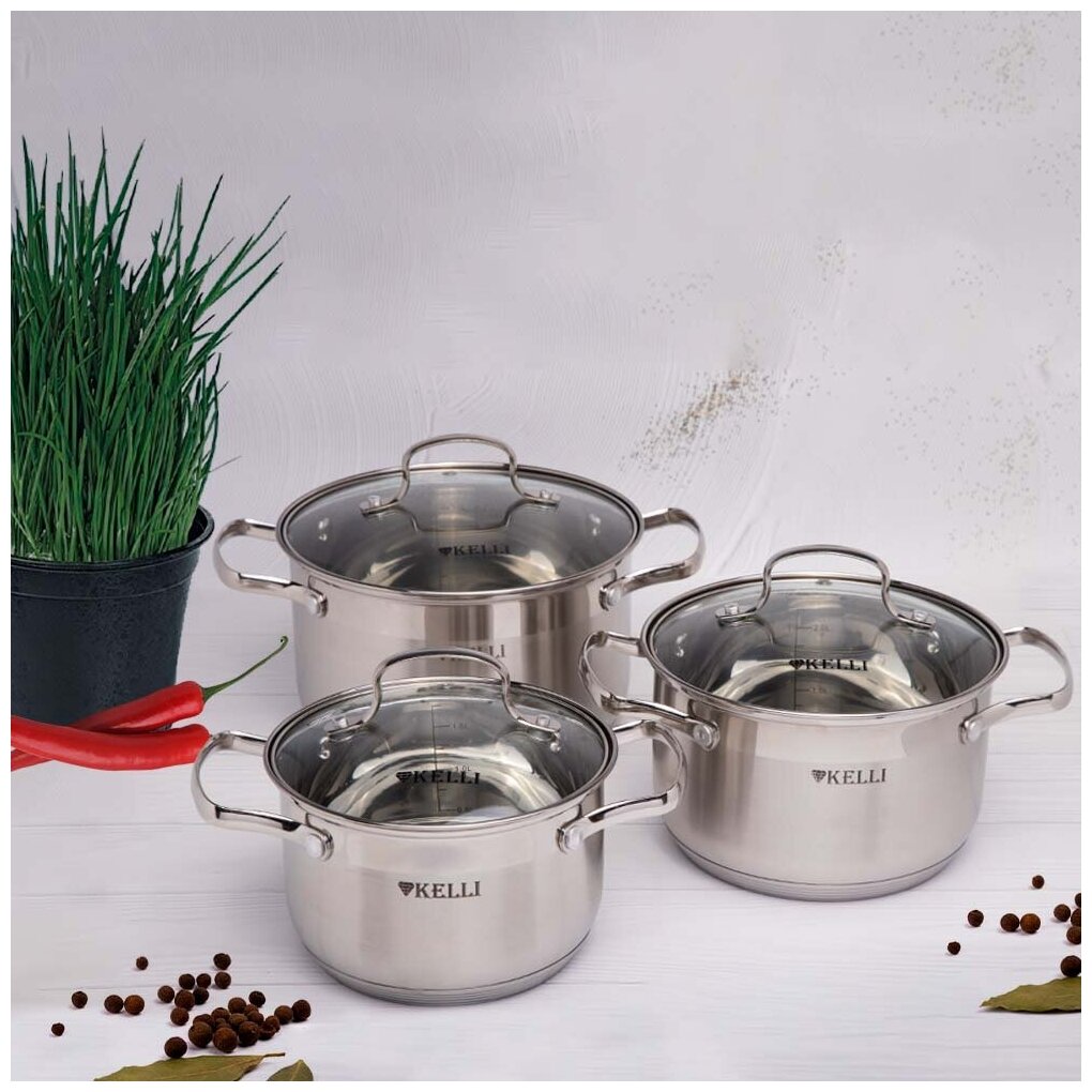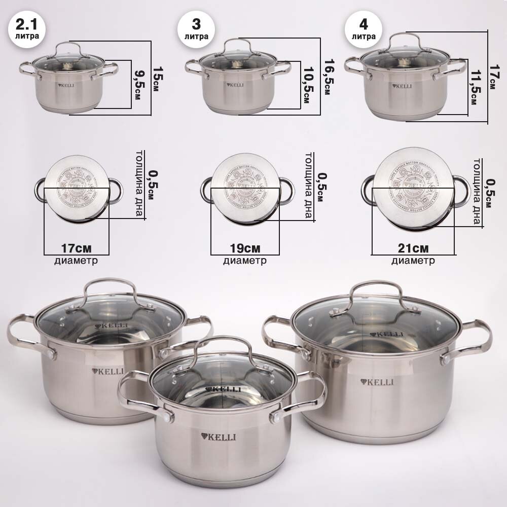 Набор кастрюль Kelli KL-4230 изготовлен из нержавеющей стали с антипригарным покрытием. Комплект состоит из трех кастрюль объемами 2,1 л, 3 л и 4 л и трех жаропрочных стеклянных крышек соответствующего диаметра. Каждая кастрюля оснащена семислойным капсулированным дном и термоизолированными ручками.