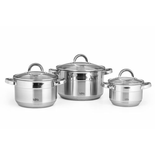 Набор посуды LARA серии «Aurora» разработан специально для хозяек, предпочитающих готовить много и впрок. Мы скомбинировали кастрюли самых востребованных объемов в одном наборе. Преимуществом данного комплекта посуды является 9-ступенчатое индукционное дно, которое подходит для всех типов плит. Привлекательный дизайн кастрюль с комбинированной полировкой стенок не оставит равнодушным. Удобство эксплуатации обеспечивают полые дугообразные ручки с зеркальной полировкой на надежных заклепках. Крышки из закаленного стекла с паровыпуском. Надежные, качественные и стильные кастрюли станут верными помощницами на вашей кухне и прослужат долгие годы.