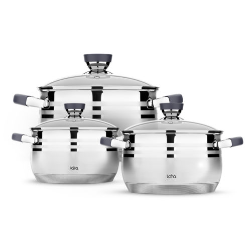 Набор посуды LARA серии «Mercury» – это кастрюли классической формы в современном прочтении. Мы совместили матовую и зеркальную полировку стали, чтобы посуда выглядела безупречно. Внутренняя мерная шкала облегчает процесс приготовления и позволяет точно следовать выбранной рецептуре. Корпус выполнен из высокоуглеродистой нержавеющей стали AISI201. Крышка с разборной ручкой и паровыпуском изготовлена из жаропрочного стекла. Стальной обод C-формы плотно прилегает к стенкам. Термоупорный силикон на ручке и крышке кастрюли защитит от ожогов. Девятиступенчатое индукционное капсулированное дно подойдет для всех типов плит. Мы защитили кастрюлю, крышку, а также силиконовые накладки от механических повреждений, бережно упаковав элементы изделия в защитную пленку. Готовьте с удовольствием в посуде LARA серии «Mercury».