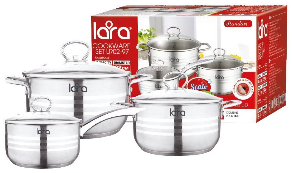 ковш: 2.3 л; кастрюли: 4.4 л, 7.7 л; 3 крышки