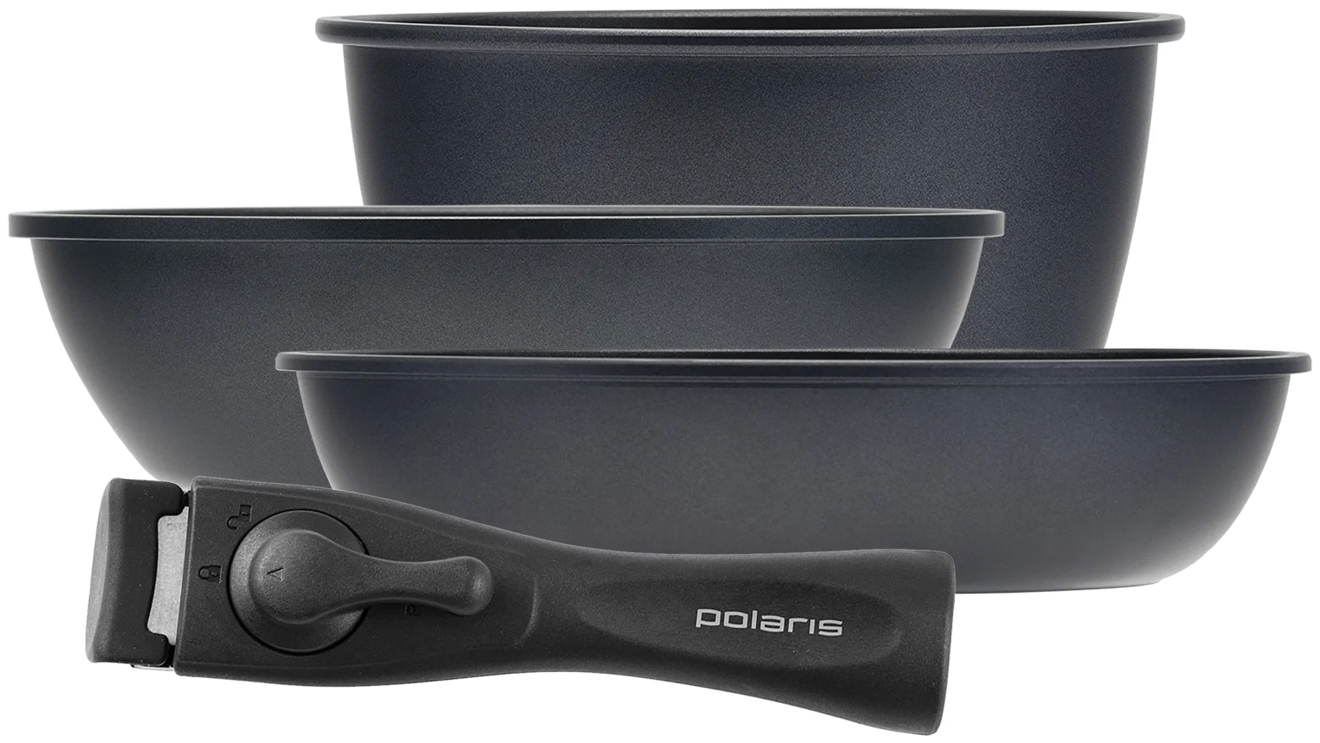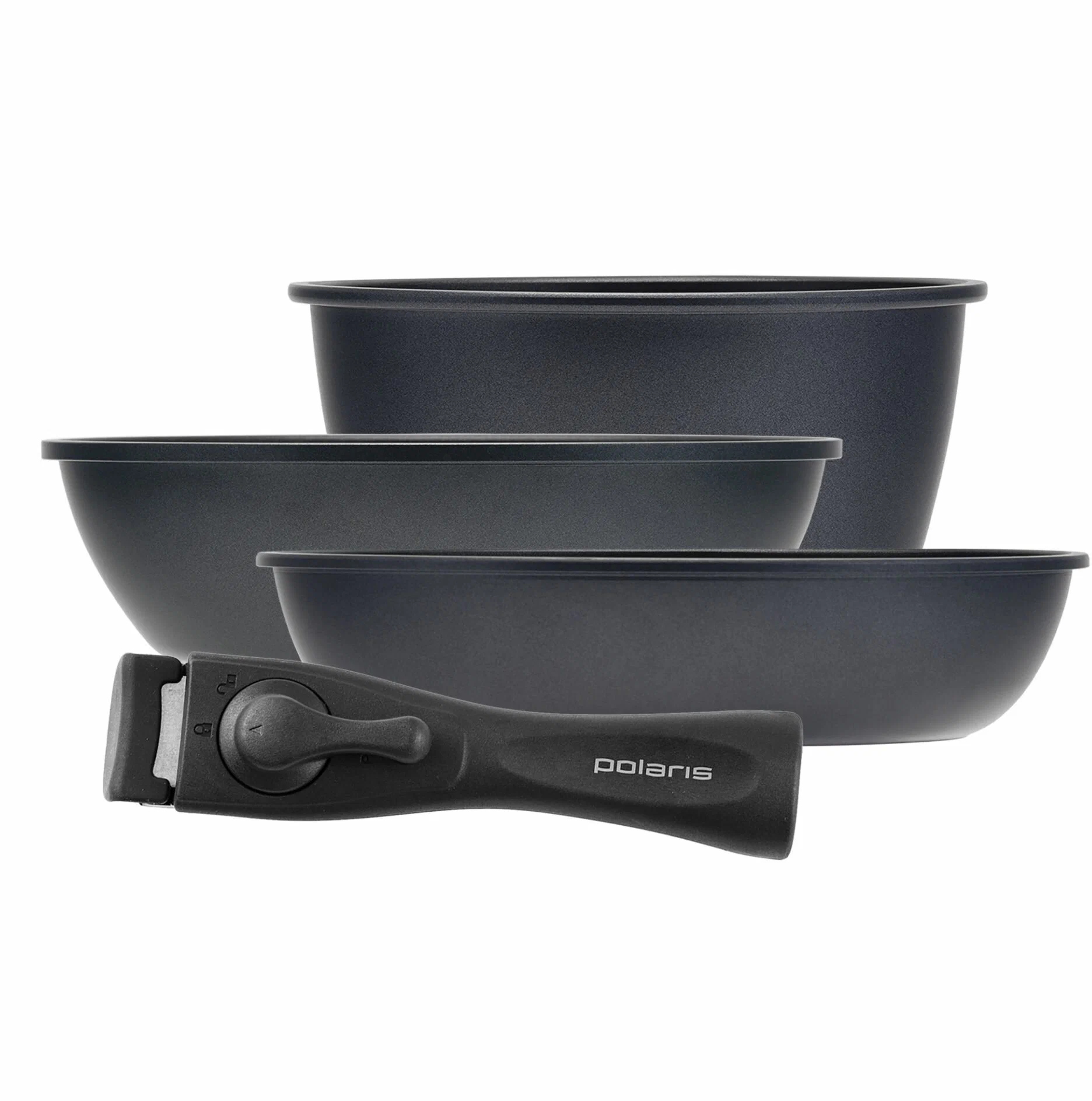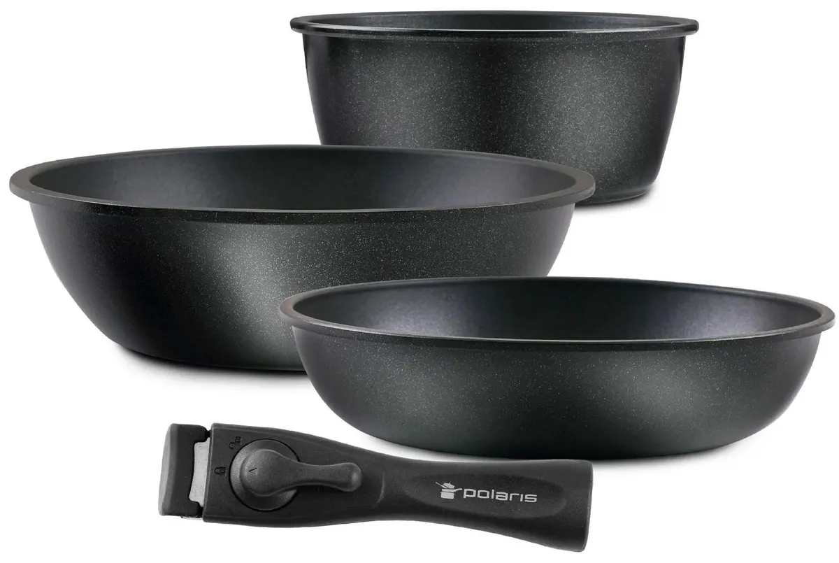 Состав набора: Глубокая сковорода 24 см – 2,5 л Сковорода 26 см – 2,5 л Ковш 18 см – 1,7 л.
