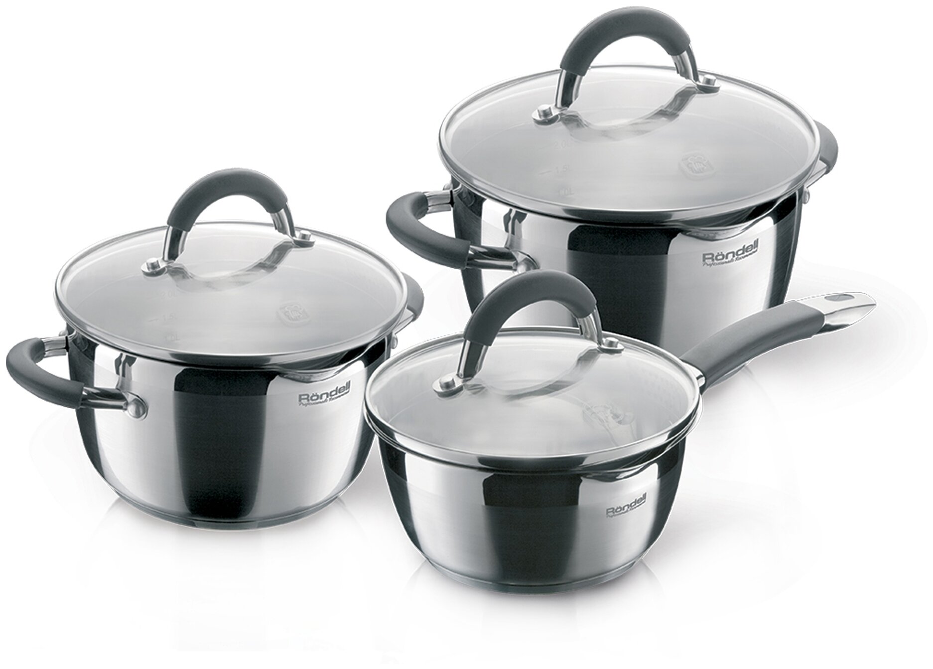 ковш: 1.3 л; кастрюли: 3.2 л, 5.7 л; 3 крышки
