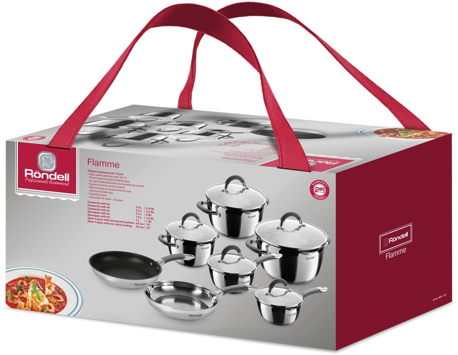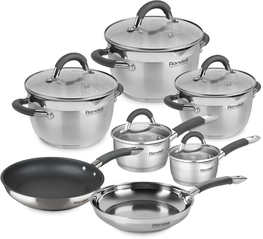 Кастрюля с крышкой 18 см (2,3 л) , кастрюля с крышкой 20 см (3,2 л) , кастрюля с крышкой 24 см (5,7 л), ковш с крышкой 14 см (1,0 л) , ковш с крышкой 16 см (1,3 л), сковорода с а/п , сковорода без а/п